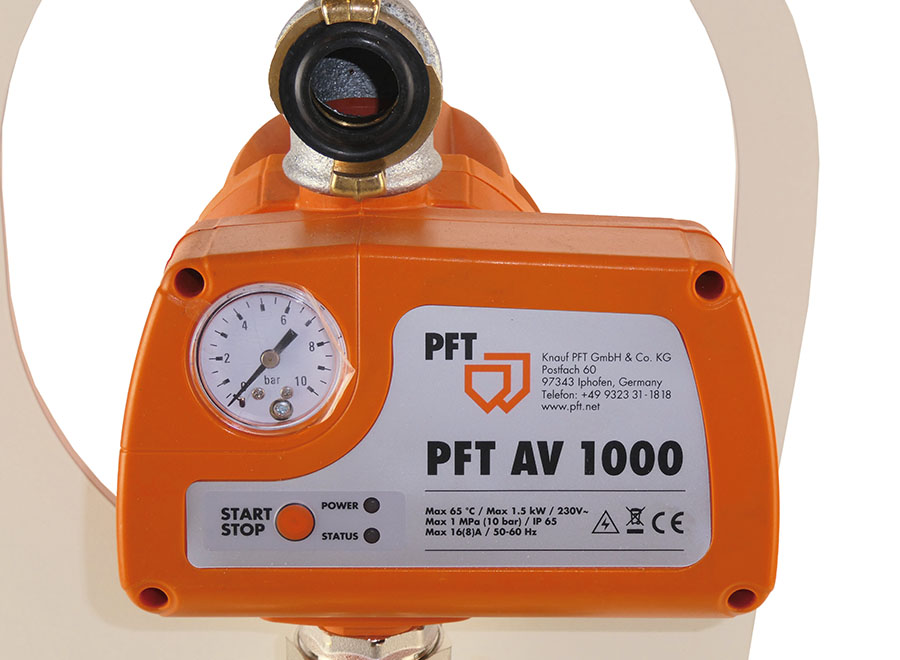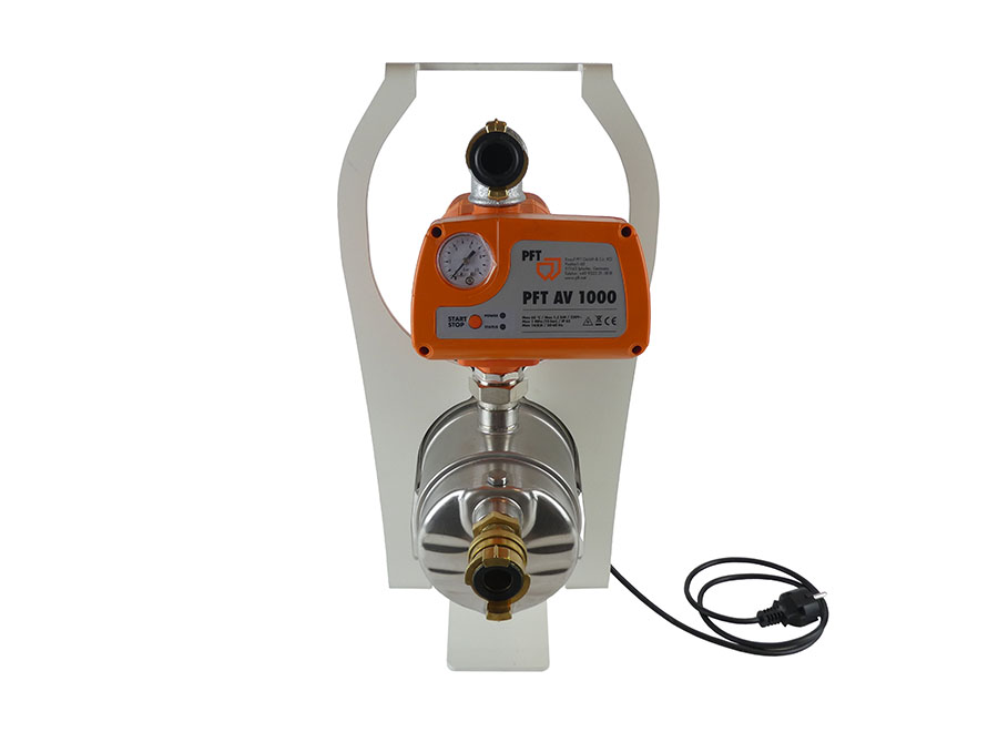 Die PFT Wasserpumpe als Saugpumpe AV1000 standalone mit integrierter Druckabschaltung und Strömungswächter inklusive Fußgestell. Mit den Druckerhöhungspumpen der AV-Serie kann direkt aus dem Wasserfass gearbeitet werden mit einer hohen Förderleistung. Die Pumpen der AVP/AVO-Serie kommen zum Einsatz, wenn es gilt, weite Strecken auf der Baustelle zu überwinden bzw. den Leistungsdruck auf über 2,5 bar an der Maschine zu halten. Automatische Druckabschaltung bei abgestellter Maschine und Leerlaufsicherung (kein Trockenlauf möglich).