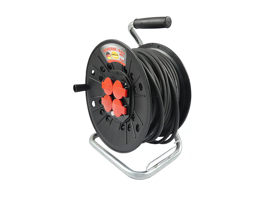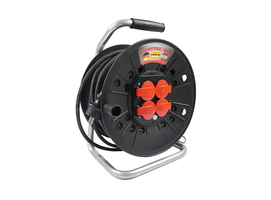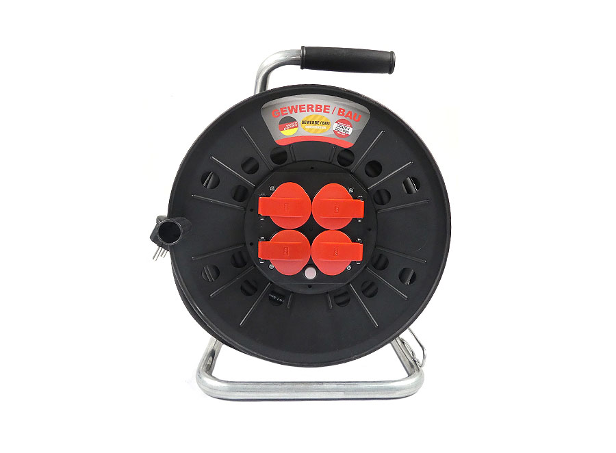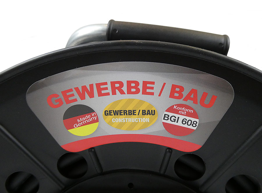 Die Kabeltrommel TOP LINE Kunststoff 40 m, HO7RN-F3 G 1.5 gem. BGI 608 wird in der Regel im Privat- und Handwerksbereich als Verlängerungsleitung für Elektroanschlüsse genutzt. Die Kabeltrommel ist für Baustellen geeignet und hat 4 eingebaute Schutzkontaktsteckdosen, welche jeweils mit einer Schutzklappe gesichert werden. Mit Hilfe einer Handkurbel (Haspel) ist ein angenehmes und gleichmäßiges Auf- und Abwickeln der Verlängerungsleitung gewährleistet. Die Kabeltrommel ist mit einem Überlastungsschutz ausgestattet. Mit diesem Überlastungsschutz wird verhindert, dass die Kabeltrommel überhitzen kann. Zudem hat sie eindämpfendes Fußgestell gegen Stöße sowie eine Feststellbremse. Die Kabeltrommel ist gemäß BGI 608 auf Baustellen zugelassen.