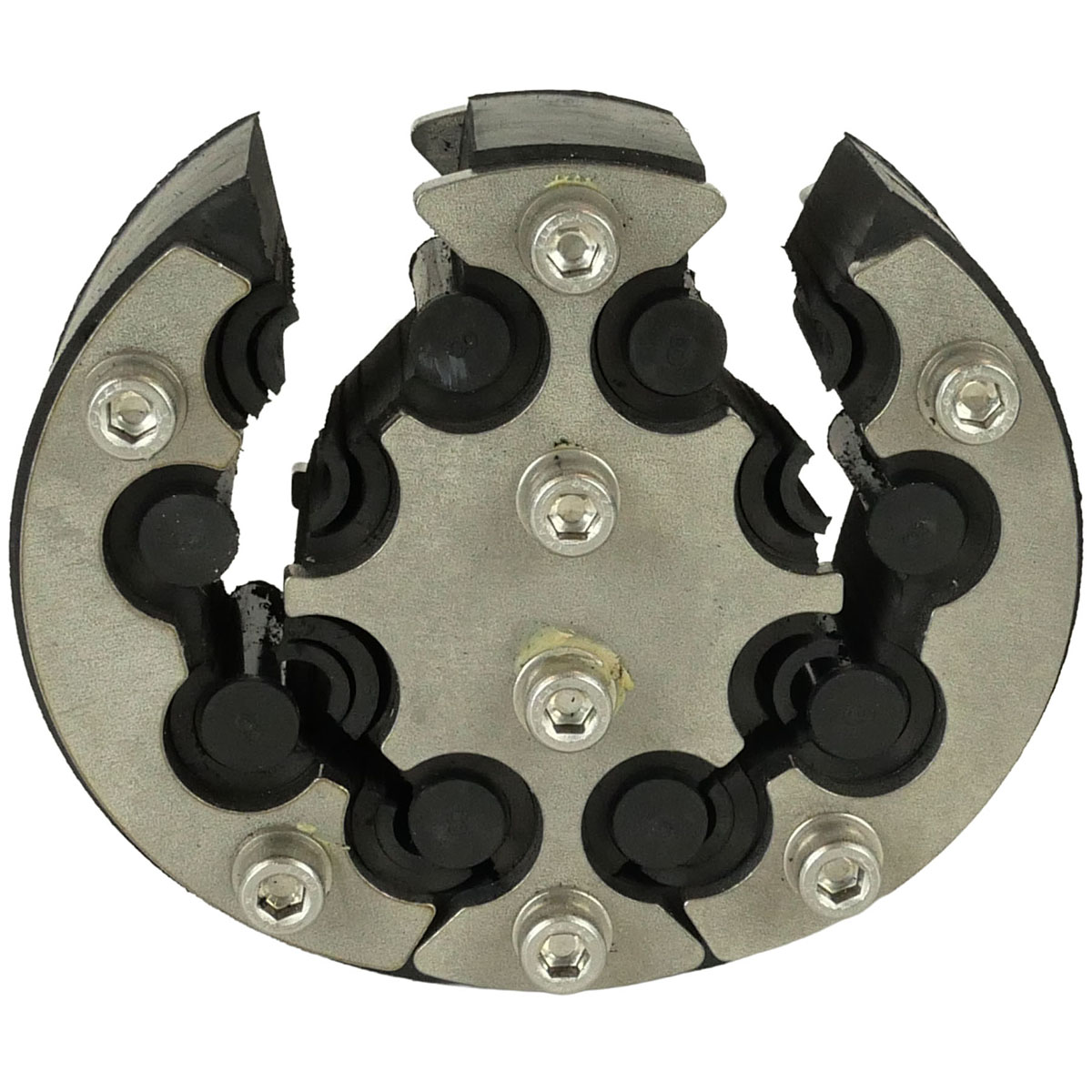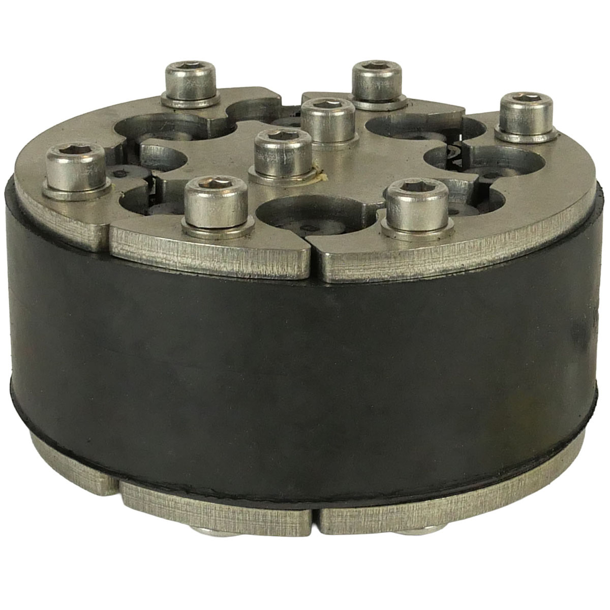 Standard-Ringraumdichtung Kabel HRD 100-SG-8/4-16,5 für 8 Kabel 4-16,5mm mit Segmentringtechnik zur individuellen Anpassung auf die Leitungsdurchmesser vor Ort. Ringraumdichtung zur Abdichtung von Kabeln in Kernbohrungen oder Futterrohren. Geteilte Ausführung zur Abdichtung von neu zu installierenden oder bereits verlegten Kabeln. Mit Gleitmittelstift. Dichtbreite 40 mm, Pressplatten 5 mm. FHRK-zertifiziert.