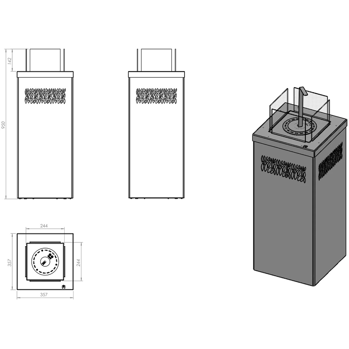 Der freistehende Biokamin KARIF verbindet moderes Design mit robuster Funktionalität und ist ideal für Terrasse, Wohnraum, Hotel oder Gastronomie. Durch die saubere Verbrennung mit Bioethanol ist der Kamin rauchfrei und spendet umweltfreundliche Wärme. Die vierseitige Verglasung ermöglicht einen freistehenden Blick auf die tanzenden Flammen. Stabiler, bodenverschraubbarer Aufbau und wetterfeste Hochtemperatur-Pulverbeschichtung erlauben einen flexiblen Einsatz drinnen wie draußen. Der Edelstahl-Bioeinsatz verhindert ein unbeabsichtigtes Auslaufen beim Kippen des Kamins. Füllstandsindikator für ein leichteres Tanken erhöht den Komfort. Die runde , belüftete Brennereinhait sorgt für optimale Luftzirkulation und gleichmäßige Flammen.
