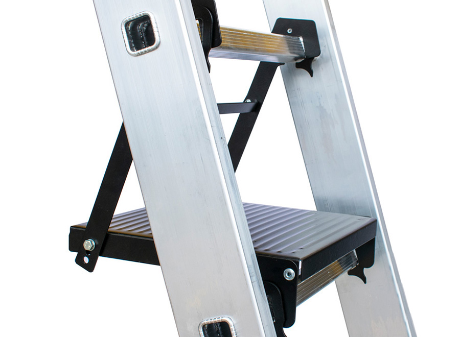 Die praktische Plattform für Multifunktionsleitern (Industrieleitern) für jede Sprosse ist pulverbeschichtet und die maximale Belastbarkeit liegt bei 150 kg. Die einhängebare Leiterplattform ermöglicht einen bequemen und sicheren Stand, alternativ kann sie auch als Ablage für Werkzeug oder Eimer verwendet werden. Man schiebt die Plattform nach innen durch und braucht sie nicht zu übersteigen. Die Abmessungen sind 265 x 250 mm und das Gewicht 1,5 kg. Passend für Sprossenleitern (Industrieleitern) mit Sprossenabstufung von 260 mm bis 300 mm und einem Sprossenprofil von 25 mm bis 29 mm.