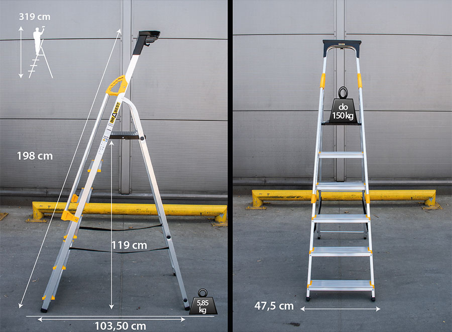 Drabest Klappleiter / Aluminiumleiter inklusive Handlauf mit einer Tragfähigkeit von maximal 150 kg. Die robuste Leiter mit bequemen, ergonomischen Handläufen, die die Stabilität und den Komfort im täglichen Gebrauch erhöhen. Sie eignet sich gut für die Arbeit im Haushalt, findet aber auch in kleinen und mittleren Unternehmen oder in Reinigungs- und Renovierungsfirmen breite Anwendung. Ein sehr hochwertiges Produkt für Bereiche mit geringer bis mittlerer Arbeitsintensität.