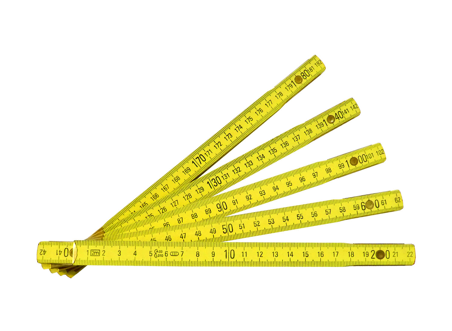 Zollstock / Meterstab 2 m aus Holz gelb lackiert hat 10 Glieder mit Stahlfeder und hat eine cm-Skala von 0 - 2 m mit mm-Skala. Die Gelenkplatten des Meterstabs sind aus Stahlblech und die Einrastung findet bei 180° statt. Der Zollstock hat eine Genauigkeitsklasse III EC und eine gute Qualität.