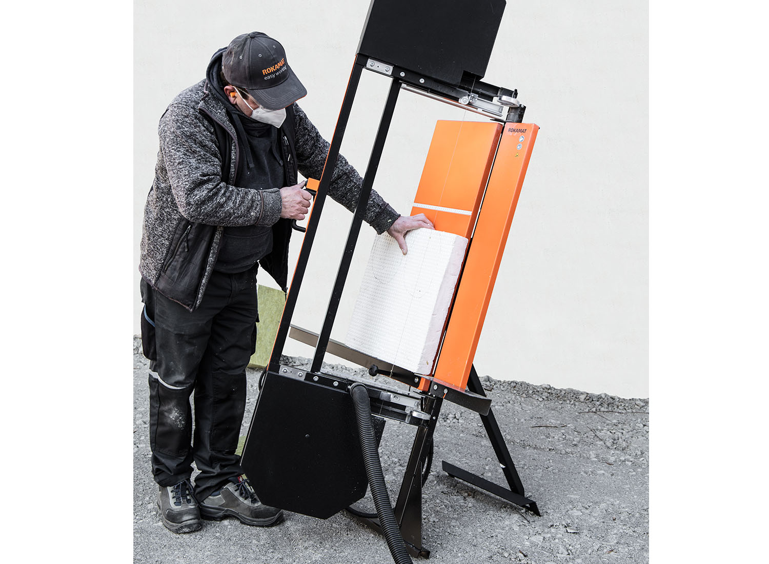Das ROKAMAT Akku-Dämmstoffschneider TIGRIS 850 CX inkl. 2 Akkus 18 V 5,2 Ah und Standard-Ladegerät schneidet mit dem einzigartigen Diamantschneidedraht ohne gesundheitsschädlichen Dämpfe Styropor, Styrodur, Mineralwolle (Stein- und Glaswolle), Hanffaser und Gipskartonplatten, Porenbeton, Multipor Mineraldämmplatten und viele weitere Materialien in Sekundenschnelle (ausgenommen Holzweichfaserplatten). In der Variante Tigris 850 können Platten mit einer Länge von bis zu 850 mm und 340 mm Dicke geschnitten werden, auch können sehr dünne Schnitte geschnitten werden. Durch Betätigung des Tasters (optional auch Fußtaster-Fernbedienung) läuft der Schneidedraht sofort an, um sich direkt danach mühelos durch das aufgelegte Material zu schneiden. Ein Wechsel des Schneidedrahtes lässt sich zügig und bequem ohne Zusatzwerkzeug durchführen. Die Konstruktion aus hochwertigem Aluminium minimiert nicht nur das Gesamtgewicht, sondern garantiert auch höchste Stabilität und langlebige Qualität. Durch das robuste Gehäuse werden Akku und Motor bestens geschützt. Eine stufenlose Winkelverstellung ermöglicht Schräg-, Keil- und Gehrungsschnitte. Die entsprechenden Einstellungen lassen sich ebenso einfach wie schnell vornehmen. Die seitlich angebrachte Absaugvorrichtung reduziert die Staubbelastung während der Arbeit auf ein Minimum, was zu einem sauberen Arbeitsumfeld beiträgt. Das Gerät kann wahlweise freistehend aufgestellt oder nach Einklappen des Standfußes auch an einem Gerüst montiert werden. Letzteres ermöglicht optimale Platzeinsparung, was bei Arbeiten auf dem Gerüst sehr geschätzt wird. Eine Akkuladung (18 V / 5,2 Ah) entspricht einer Laufzeit von bis zu 19 Minuten und reicht bei 5 Sekunden pro Schnitt für ca. 200 Schnitte. Die Standzeit des Diamantdrahtes beträgt Arbeiten bis zu 3 Einfamilienhäusern.