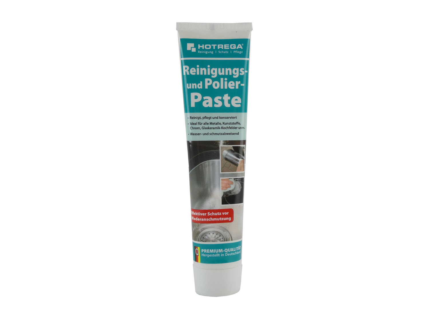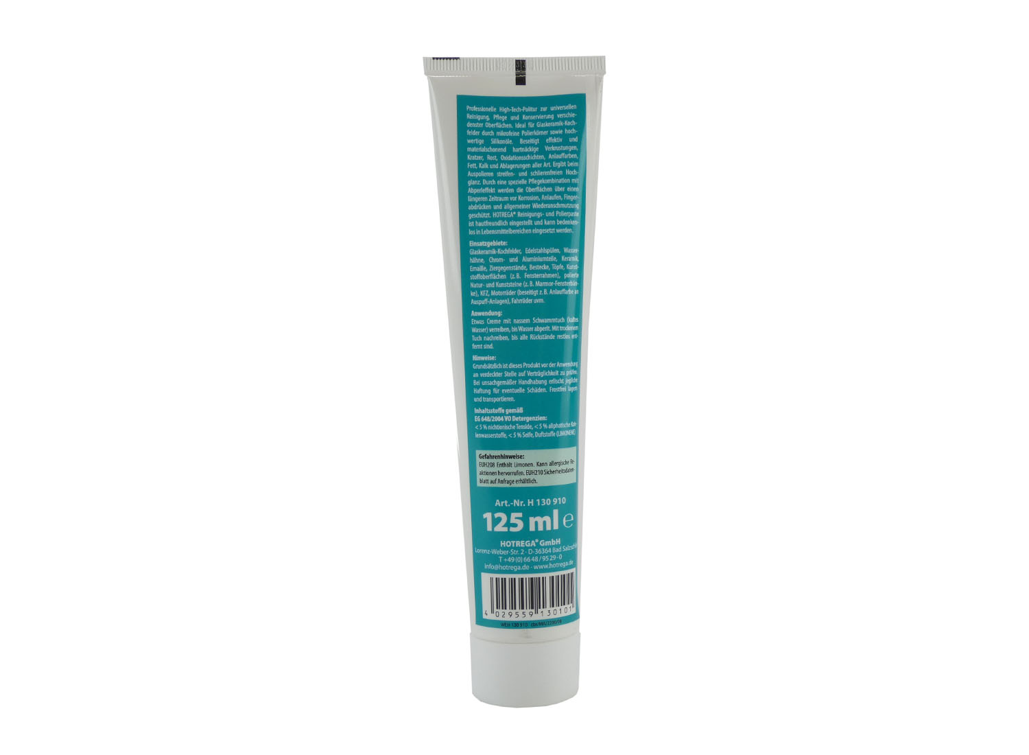 HOTREGA Reinigungspaste / Polierpaste 125 ml ist eine multifunktionelle, professionelle High-Tech-Politur zur universellen Reinigung, Pflege und Konservierung verschiedenster Oberflächen. Ideal für Glaskeramik-Kochfelder durch mikrofeine Polierkörner sowie hochwertige Silikonöle. Beseitigt effektiv und materialschonend hartnäckige Verkrustungen, feine Kratzer, Rost, Oxidationsschichten, Anlauffarben, Fett, Kalk und Ablagerungen aller Art. Ergibt beim Auspolieren streifen- und schlierenfreien Hochglanz. Durch eine spezielle Pflegekombination mit Abperleffekt werden die Oberflächen über einen längeren Zeitraum vor Korrision, Anlaufen, Fingerabdrücken und allgemeiner Wiederanschmutzung geschützt. HOTREGA Reinigungspaste / Polierpaste ist hautfreundlich eingestellt und kann bedenkenlos in Lebensmittelbereichen eingesetzt werden.