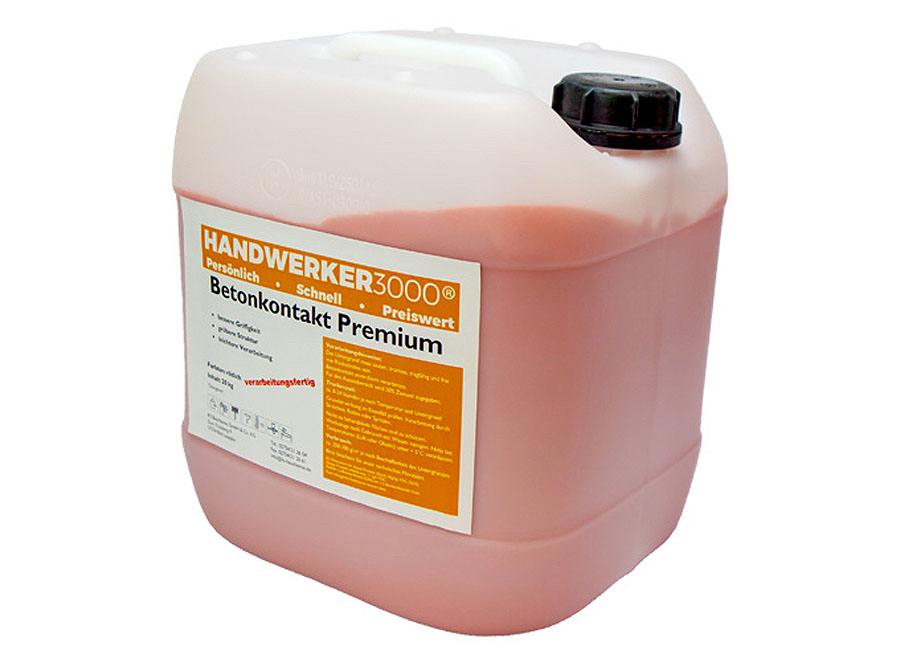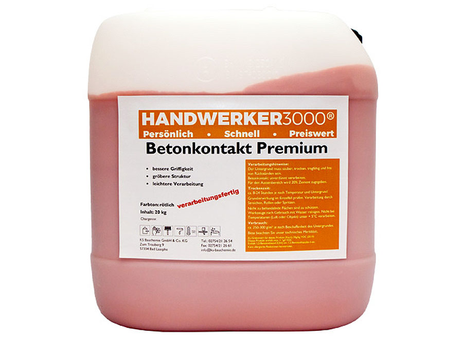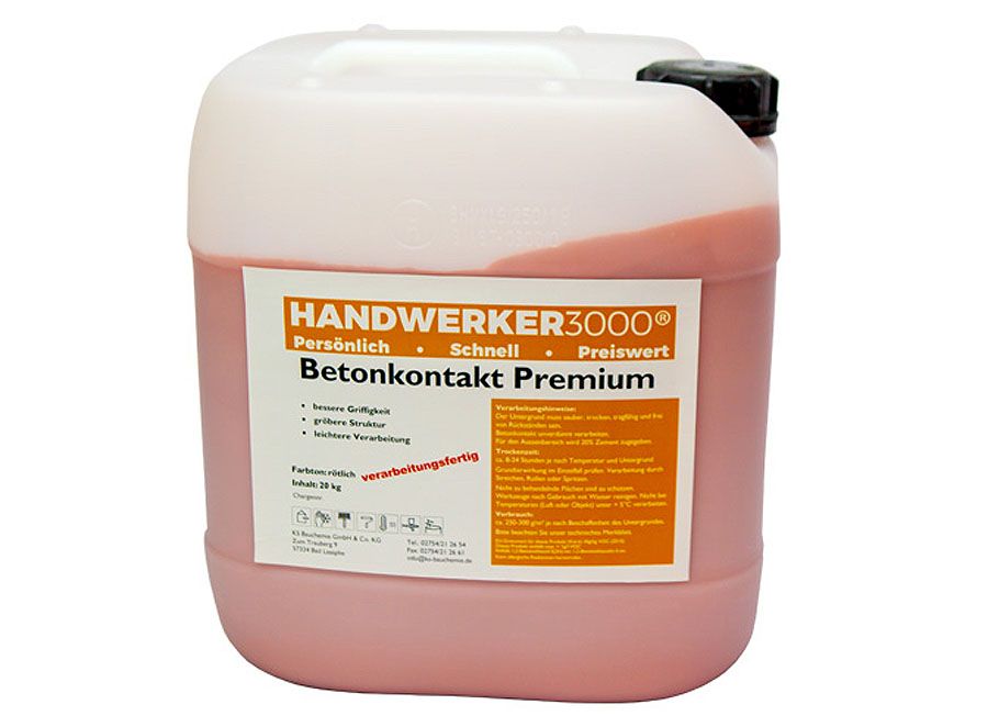 Handwerker3000 Betonkontakt PREMIUM verarbeitungsfertig 20 kg-Kanister wird zur Vorbehandlung für Untergründe im Innen- und Außenbereich genutzt. Er wird ohne weitere Zugabe von Wasser verarbeitet! Er zeichnet sich durch eine gröbere Struktur aus, welche für eine noch bessere Haftung sorgt. Die wässrige Styrolacrylat-Dispersion ist für dichte, nicht saugende Oberflächen wie Beton, Styropor und Styrodur geeignet und wird durch Streichen, Rollen oder Spritzen auf die Oberfläche aufgebracht. Für die optimale Haftung muss der Untergrund tragfähig, trocken und frei von losen Teilen sein. Das Auftragen des Haftgrundes kann in mehreren Arbeitsschritten erfolgen, um dünne Schichten zu ziehen (Zwischentrocknung) und somit Zeit bei der Trocknung zu sparen. Bevor der Putz aufgetragen werden kann, muss der Handwerker3000 Betokontakt durchgetrocknet sein und darf nicht mehr kleben. Die rötliche Einfärbung, sobald der Betonkontakt getrocknet ist, erleichtert die Kontrolle bereits bearbeiteter Flächen. Das Material sollte nicht unter +5°C und über +30°C verarbeitet und getrocknet werden.