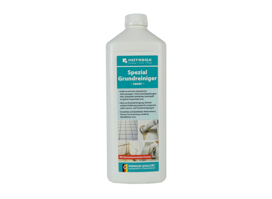 Der HOTREGA Spezial Grundreiniger -sauer- (1 Liter) ist ein stark saurer Krustenbrecher (Konzentrat) mit Korrisionsschutz-Formel.