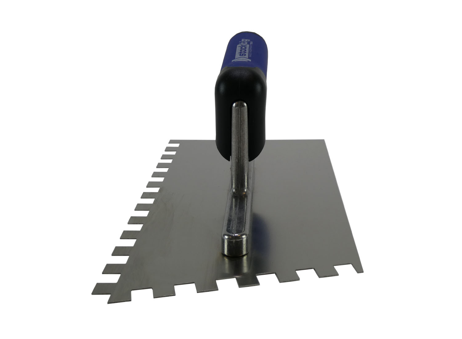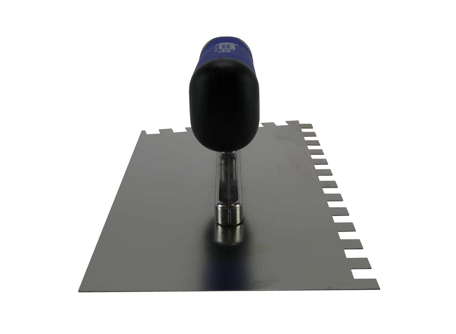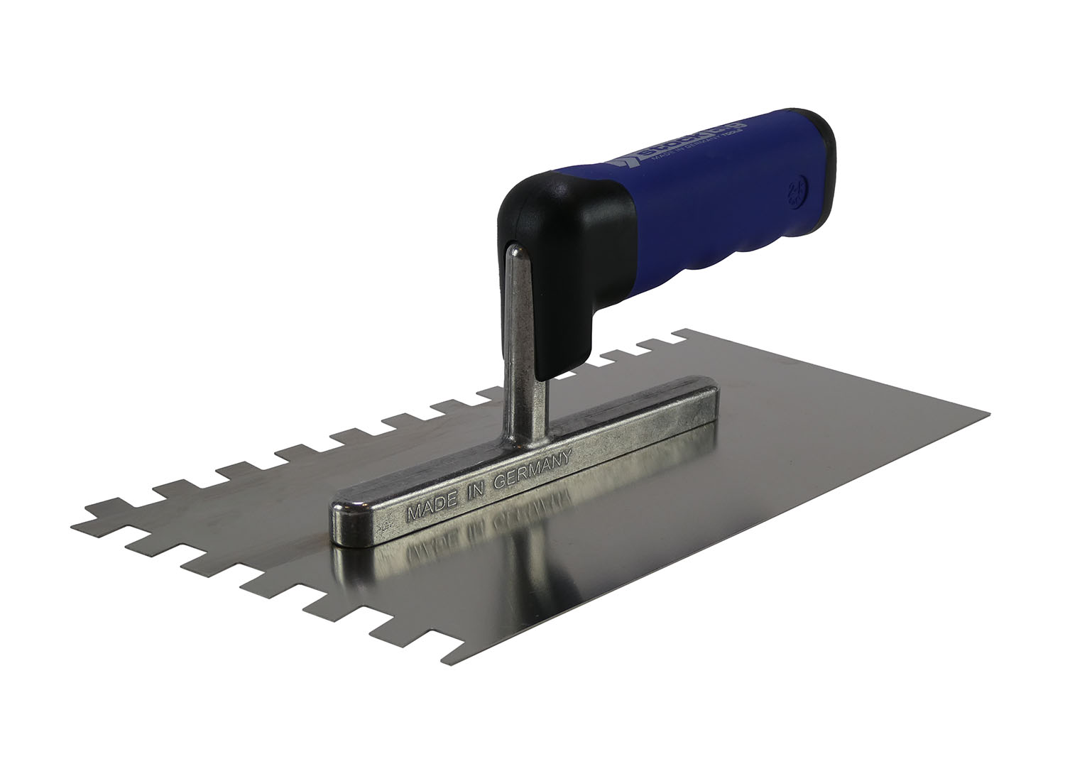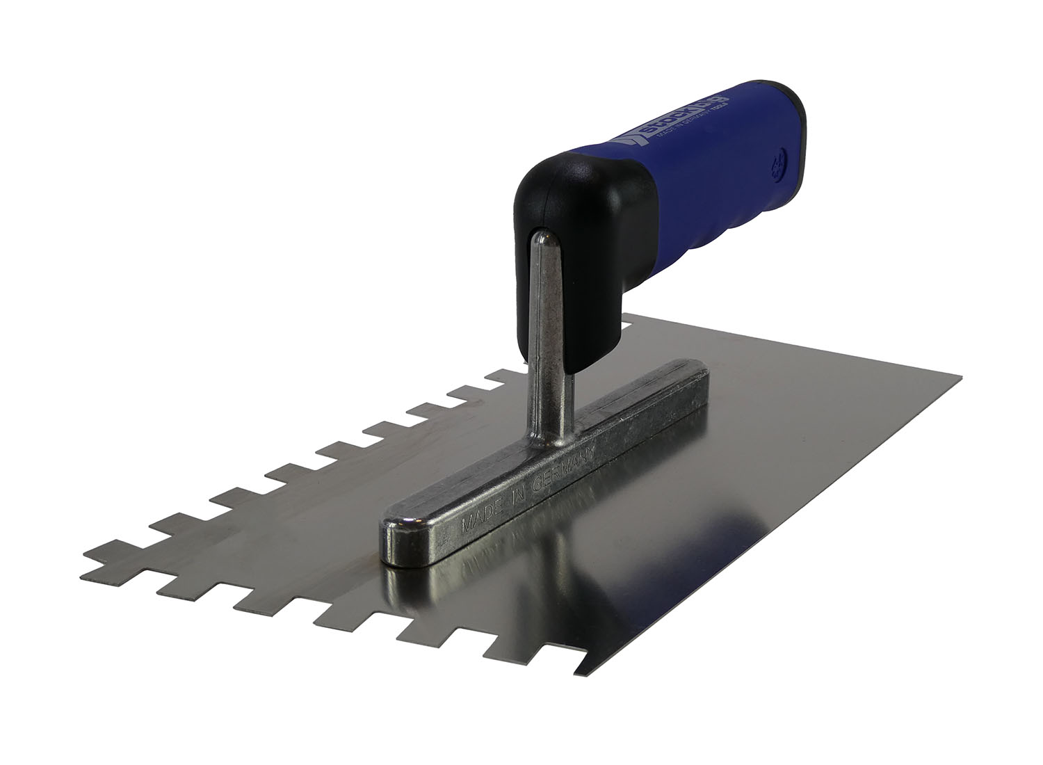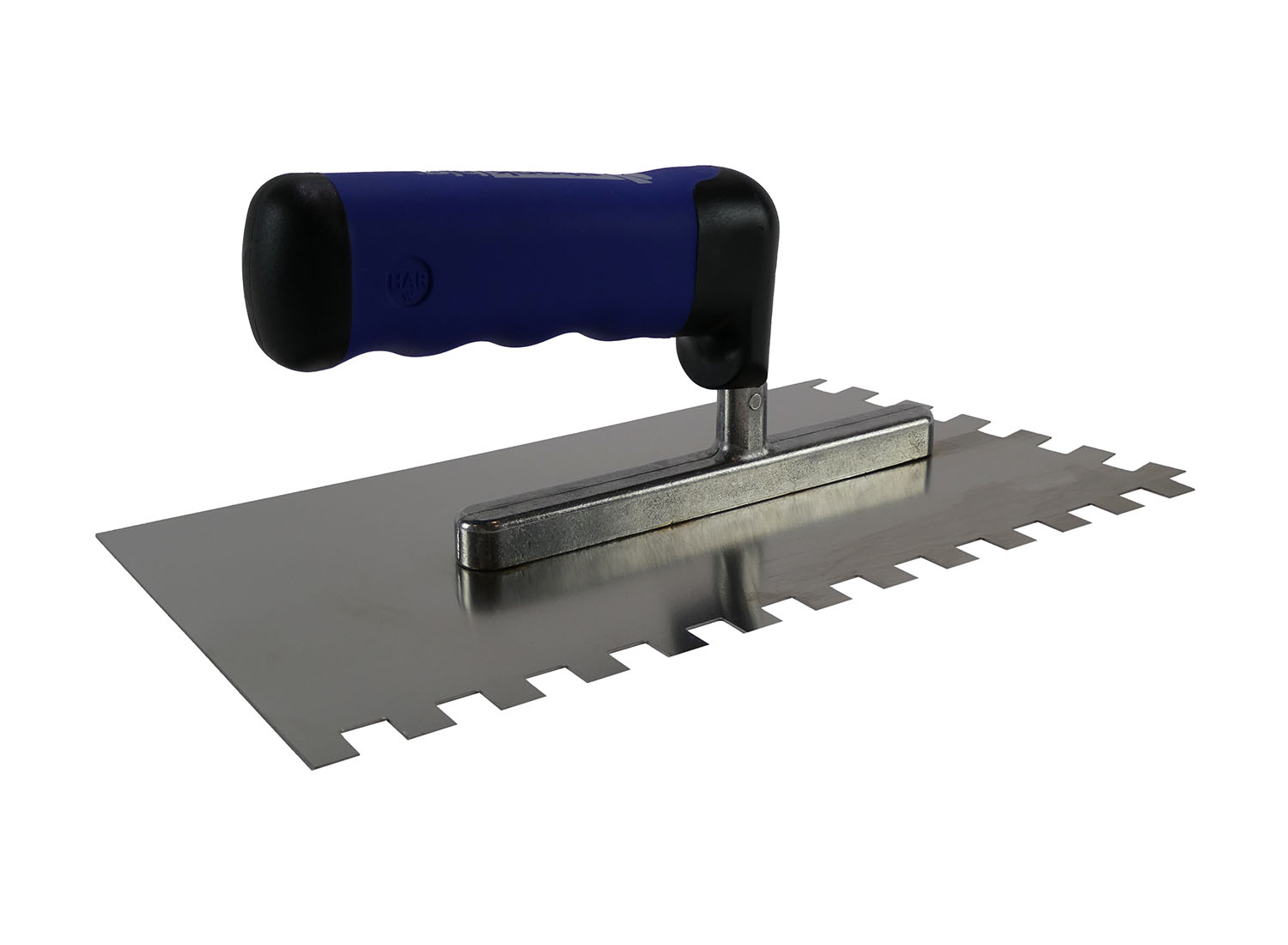 Diese Glättekelle "Clever" ist mit einem rostfreien Blatt und einem 2-K-Softgriff ausgestattet. Sie eignet sich ideal für das problemlose Verteilen von Fliesenkleber an Wandanschlüssen und schwer zugänglichen Stellen. Die gezahnte Struktur verhindert ein Verhaken und Verkratzen an der Wand und ermöglicht eine schnellere und gleichmäßige Verteilung des Fliesenklebers. Der Griff ist ergonomisch gestaltet und sorgt für eine angenehme Handhabung. Die Zahnung ist entscheidend, um die richtige Menge Mörtel oder Kleber aufzutragen. Durch die Zähne enstehen beim Auftragen des Materials gleichmäßige Rillen, die eine bessere Haftung gewährleisten. Für größere Flächen verwendet man eine größere Zahnung, für kleinere Flächen eine kleinere Zahnung.