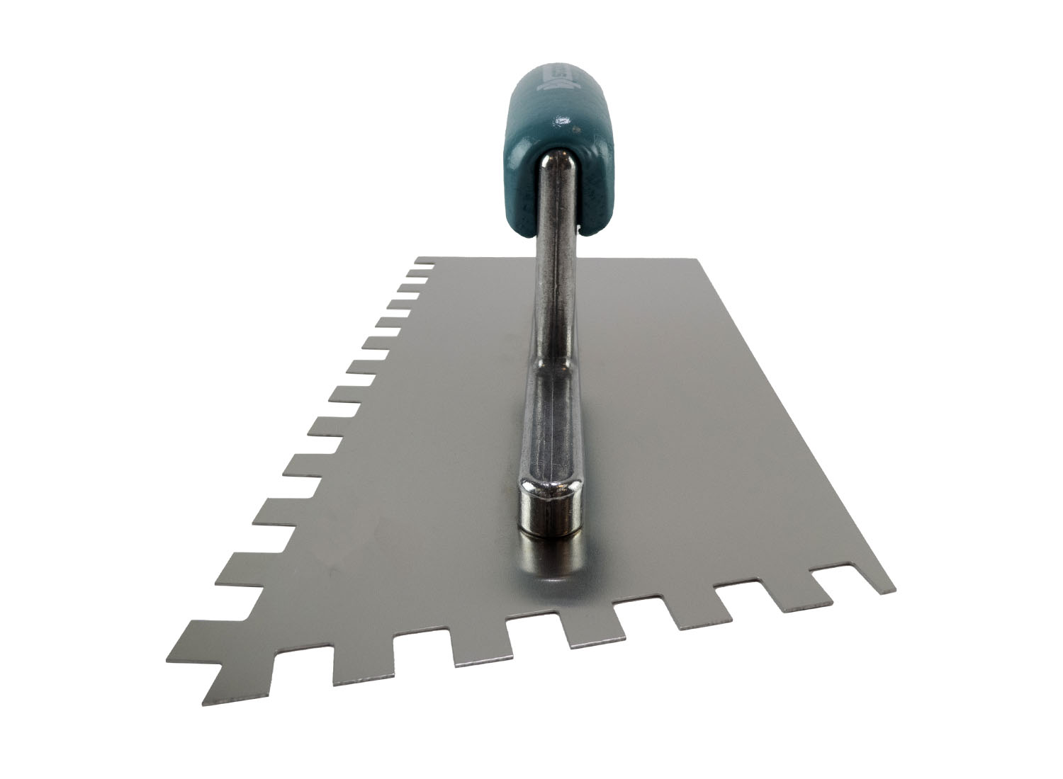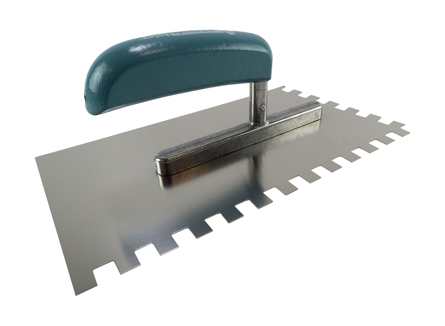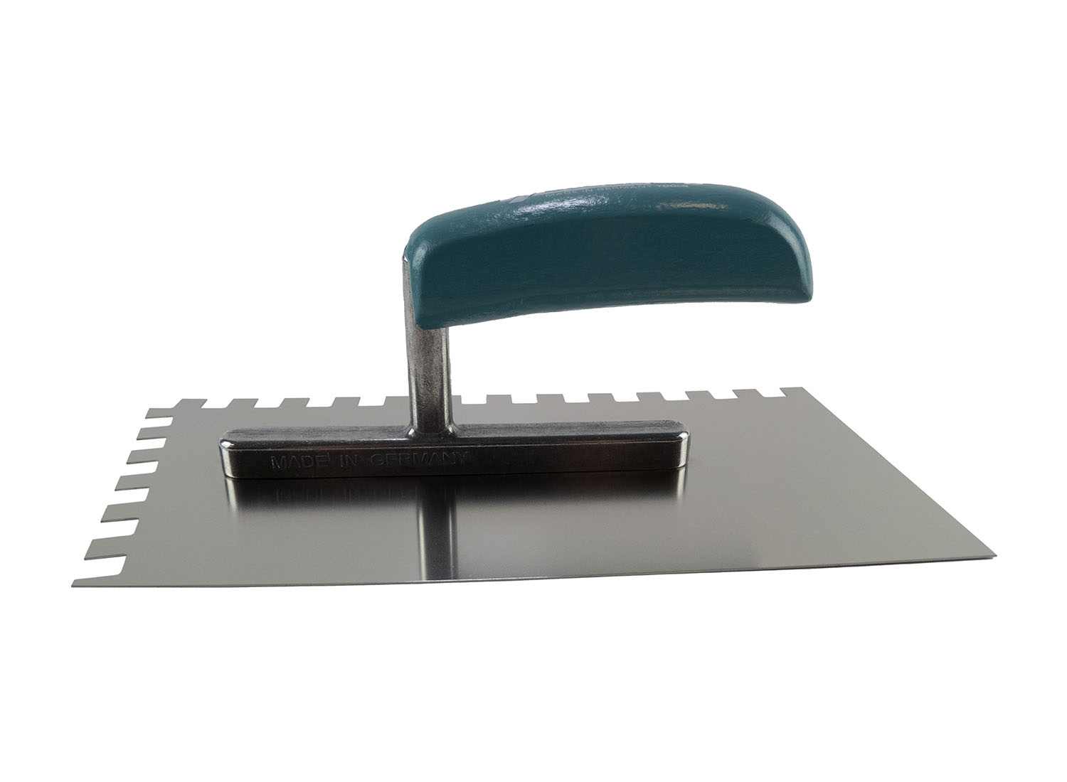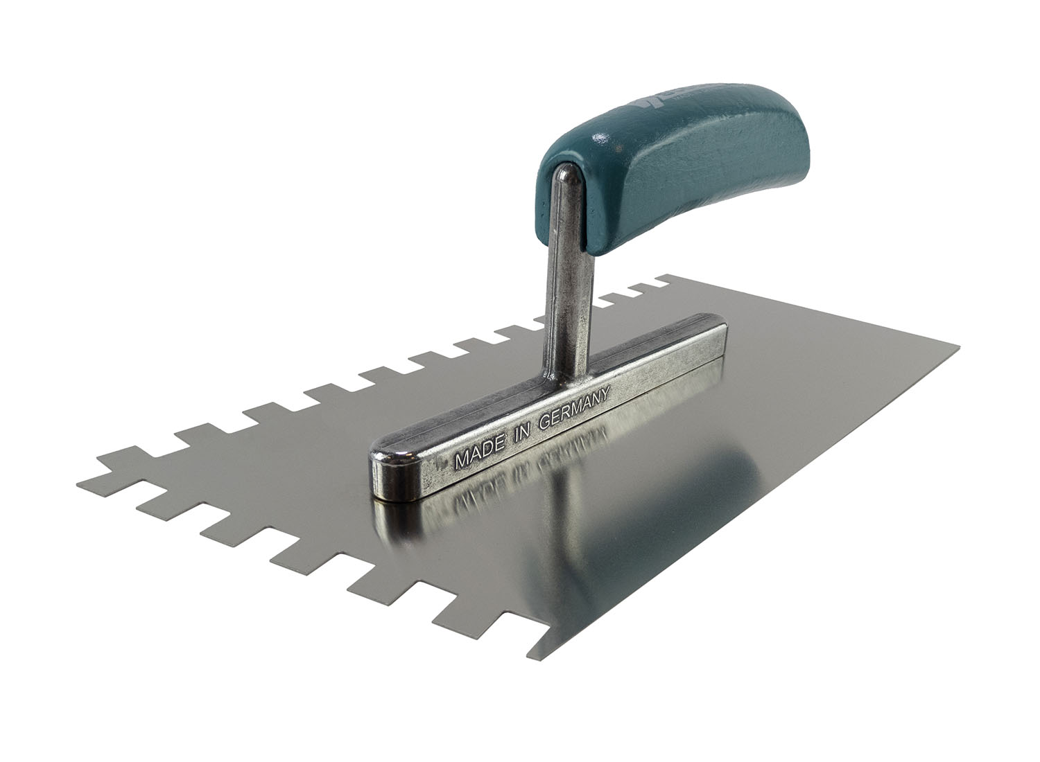 Bei dieser >stockbig Glättekelle gezahnt "Clever" rostfrei mit Holzgriff handelt es sich um eine Glättkelle mit einem rostfreien Blatt und einem geschweiften Holzgriff. Mit dieser Glättekelle gibt es kein Verhaken und kein Verkratzen mehr an der Wand. Der Fliesenkleber kann ganz problemlos an Wandanschlüssen und an unzugänglichen Stellen verteilt werden. Eine schnellere und ganzflächige Kleberverteilung ist hiermit garantiert. Die Zahnung ist entscheidend, um die richtige Menge Mörtel oder Kleber aufzutragen. Durch die Zähne enstehen beim Auftragen des Materials gleichmäßige Rillen, die eine bessere Haftung gewährleisten. Für größere Flächen verwendet man eine größere Zahnung, für kleinere Flächen eine kleinere Zahnung.