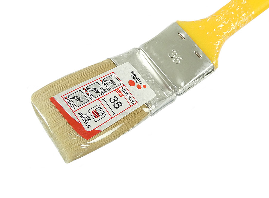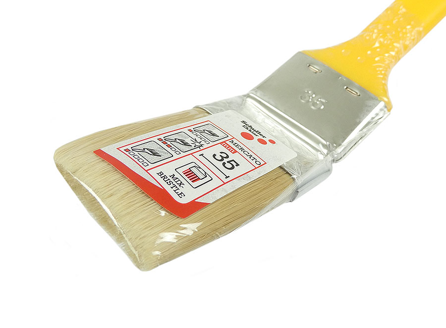 Der SCHULLER Heizkörperpinsel MERCATO HP, aus der Familie der Flachpinsel, wird zum Auftragen von Farbe an Wänden, Decken, Fassaden und weiteren Oberflächen verwendet. Flachpinsel verteilen die Farbe besonders gut und können quer eingesetzt werden, um relativ schmale Striche zu ziehen oder vorteilhafter in Ecken zu gelangen. Die hellen Borsten werden in einer verzinkten Zwinge verklebt und auf den Stiel aufgeschoben. Der Heizkörperpinsel eignet sich für Dispersionen, Wandfarben und lösemittelhaltige Lacke. Wir bieten diesen Heizkörpinsel in 2 Breiten an: 25 mm und 35 mm (siehe unter Varianten). Borstenlänge und Stärke sind ebenfalls individuell und können Sie bitte ebenfalls aus den Technischen Daten der einzelnen Varianten entnehmen.