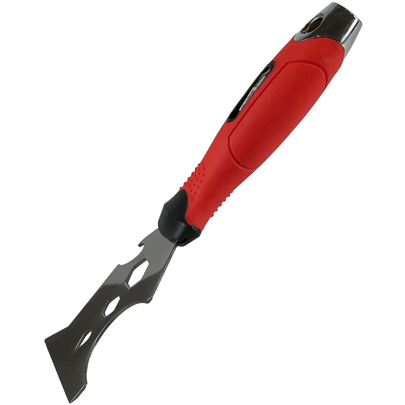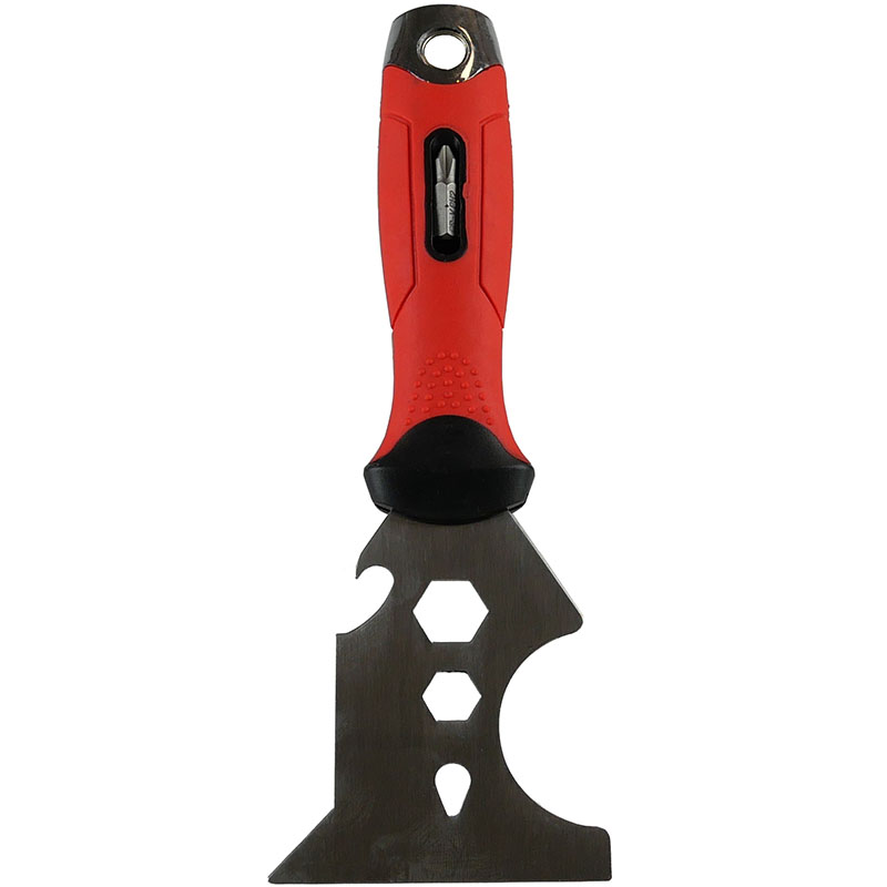 Vielseitiger Multifunktionsschaber mit 75 mm breiter Edelstahlklinge (Blattstärke 2 mm), flacher Spachtelkante, ergonomischem Griff, zusätzliche Schlagkappe für den Einsatz als Hammer, Nagel-Öse zum Herausziehen von Nägeln und Stiften, Extra-Bit im Griff, eine Schaberrundung zum Abziehen (Reinigen) von Farbrollen, Flaschenöffner / Dosenöffner und 2 Größen zum Anziehen und Lockern von Muttern. Der Multifunktionsspachtel ist ideal geeignet für umfangreiche Schabanwendungen an flachen Oberflächen, Ecken und Rundungen. Der Universalschaber hat einen festen Halt durch den ergonomischem Griff aus 2K-Kunststoff.