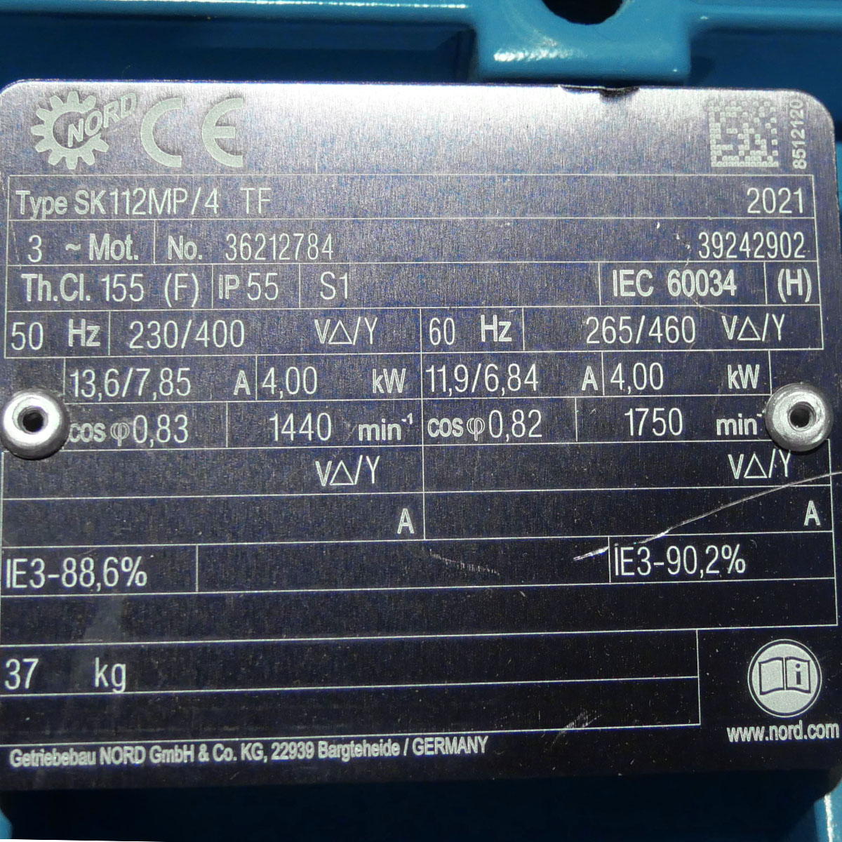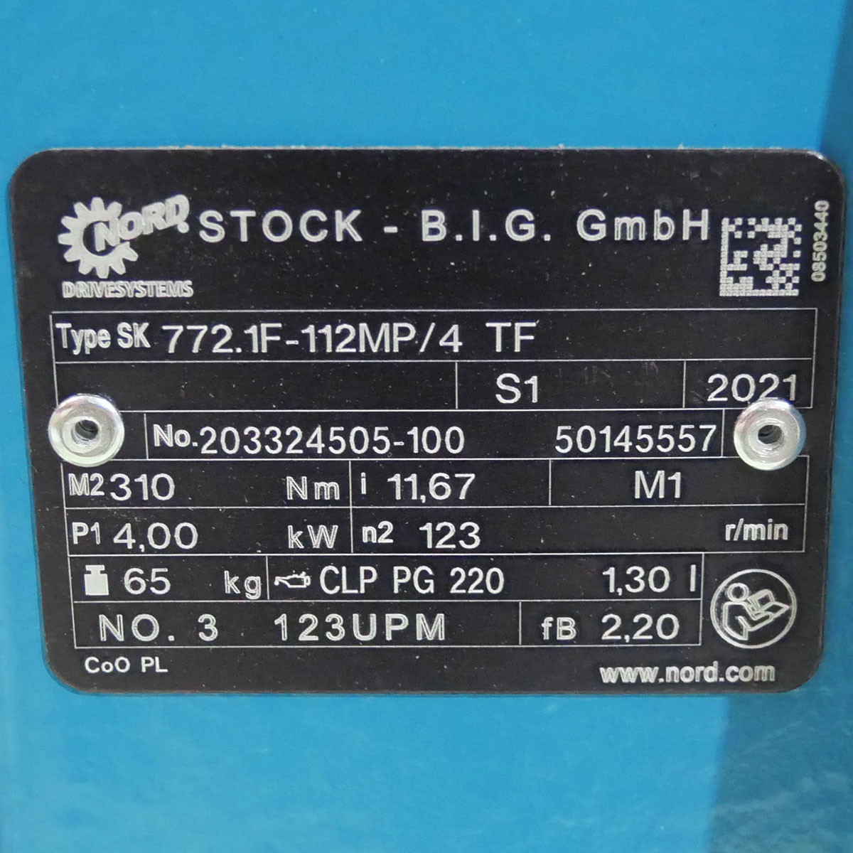 Der Getriebemotor hat eine Leistung von 7,5 kW und läuft bis zu 123 U/min, passend für >stockbig No.3 und andere baugleiche Putzmaschinen.