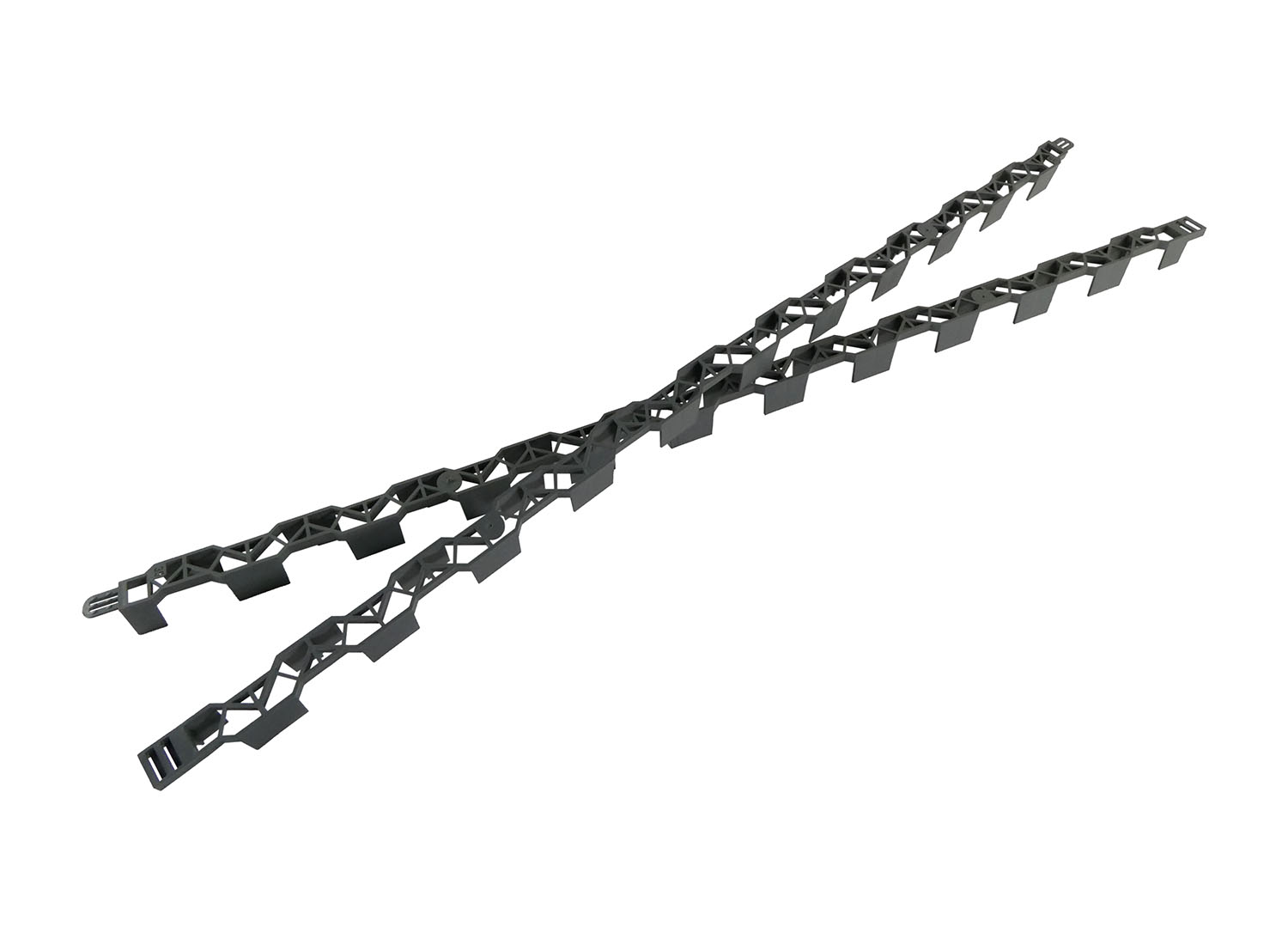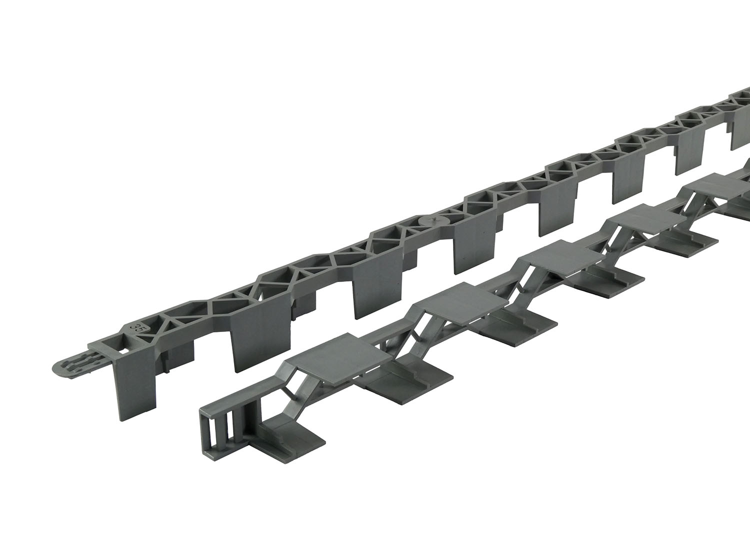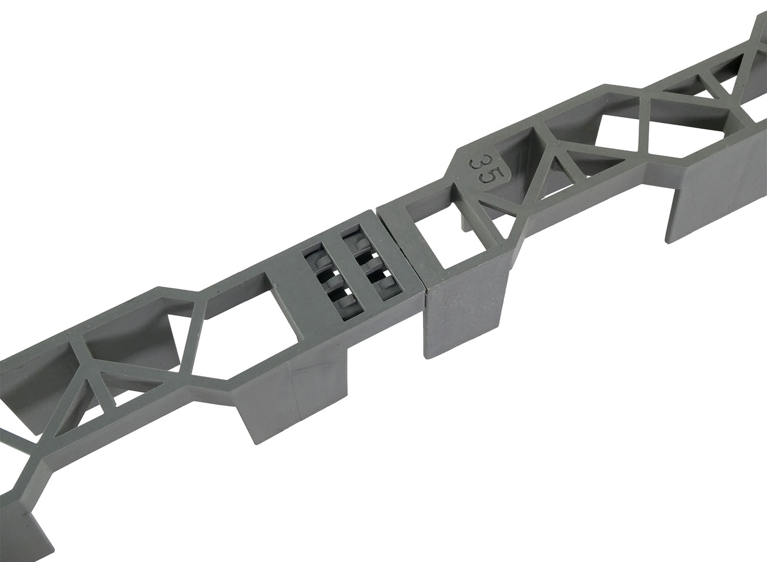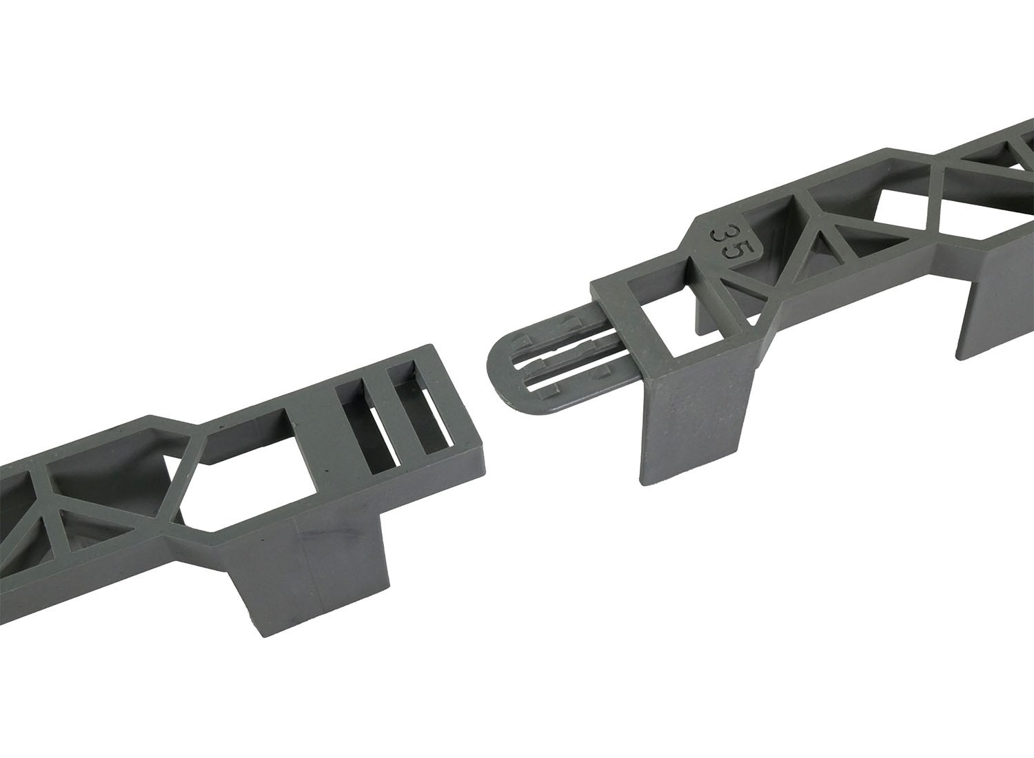 Großflächiger und besonders stabiler Abstandhalter, vorwiegend für die untere Bewehrung. Besonders guter Betonfluss durch große seitliche und obere Aussparungen. Für Sichtbeton und Elementdecken nur bedingt geeignet. Aufgrund der besseren Kippstabilität empfehlen wir ab einer Betondeckung von 40 mm Drupak "2". Durch Steckkupplung beliebig verlängerbar, Fertigungslänge 1 m.