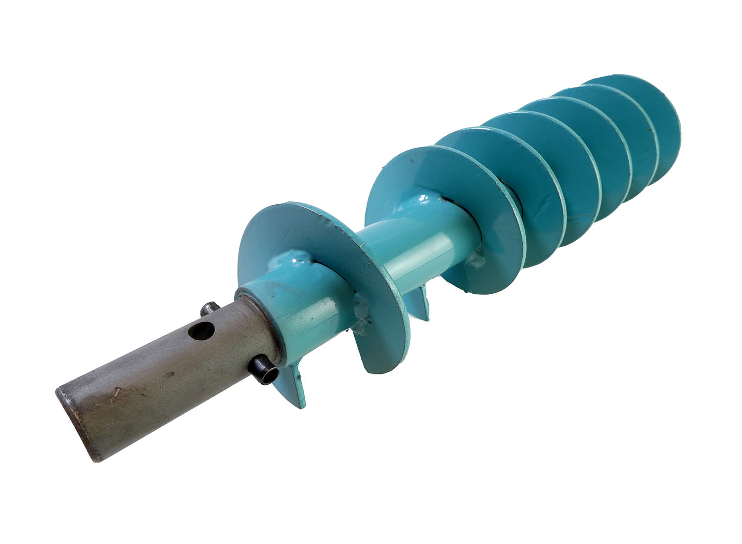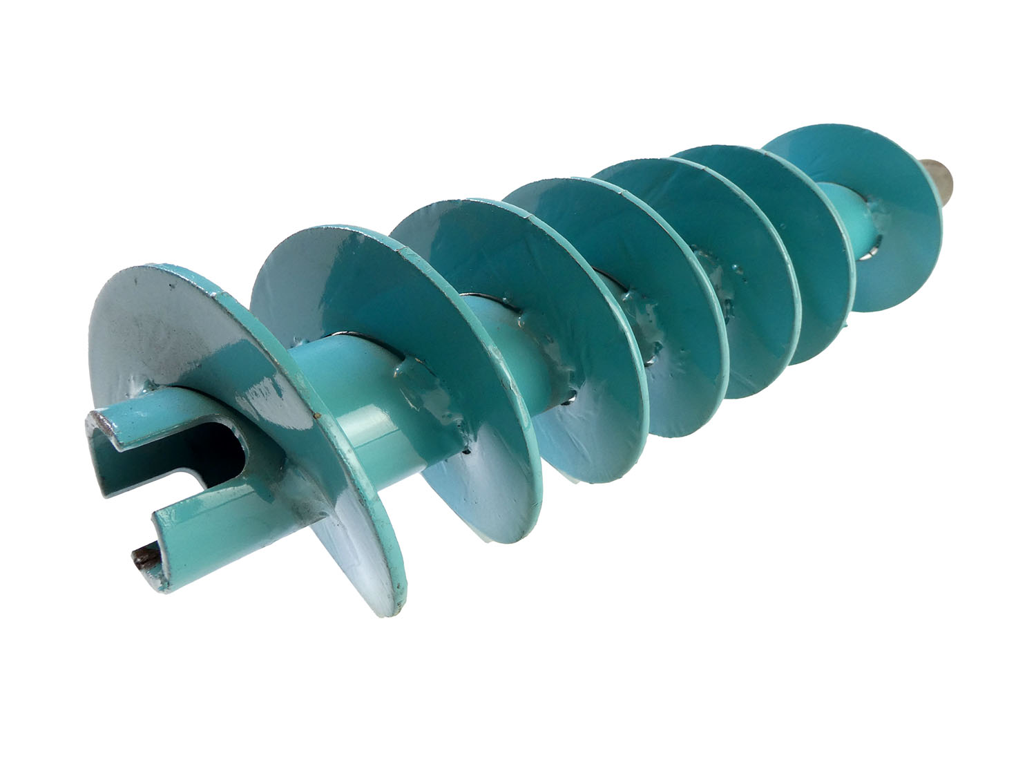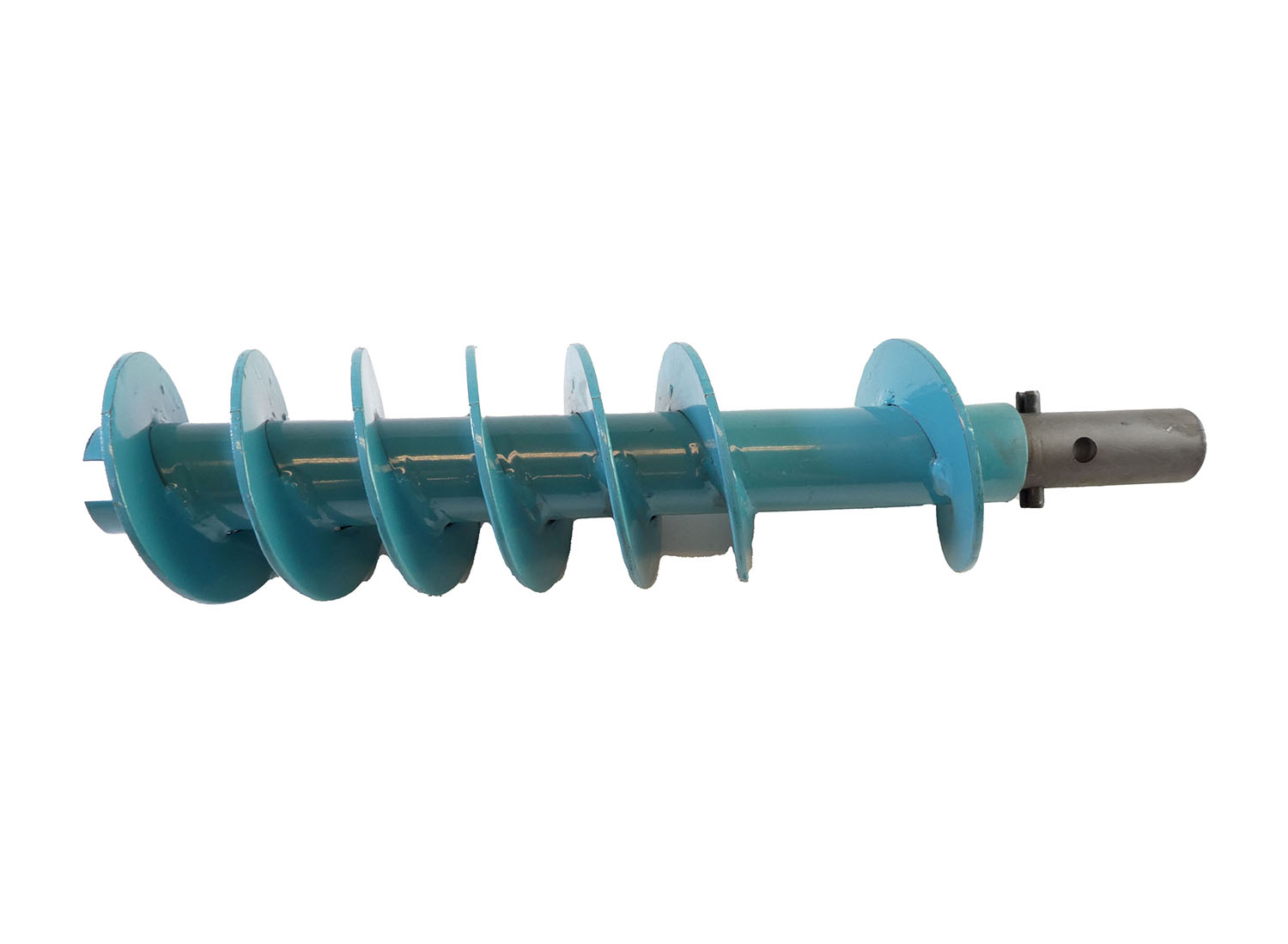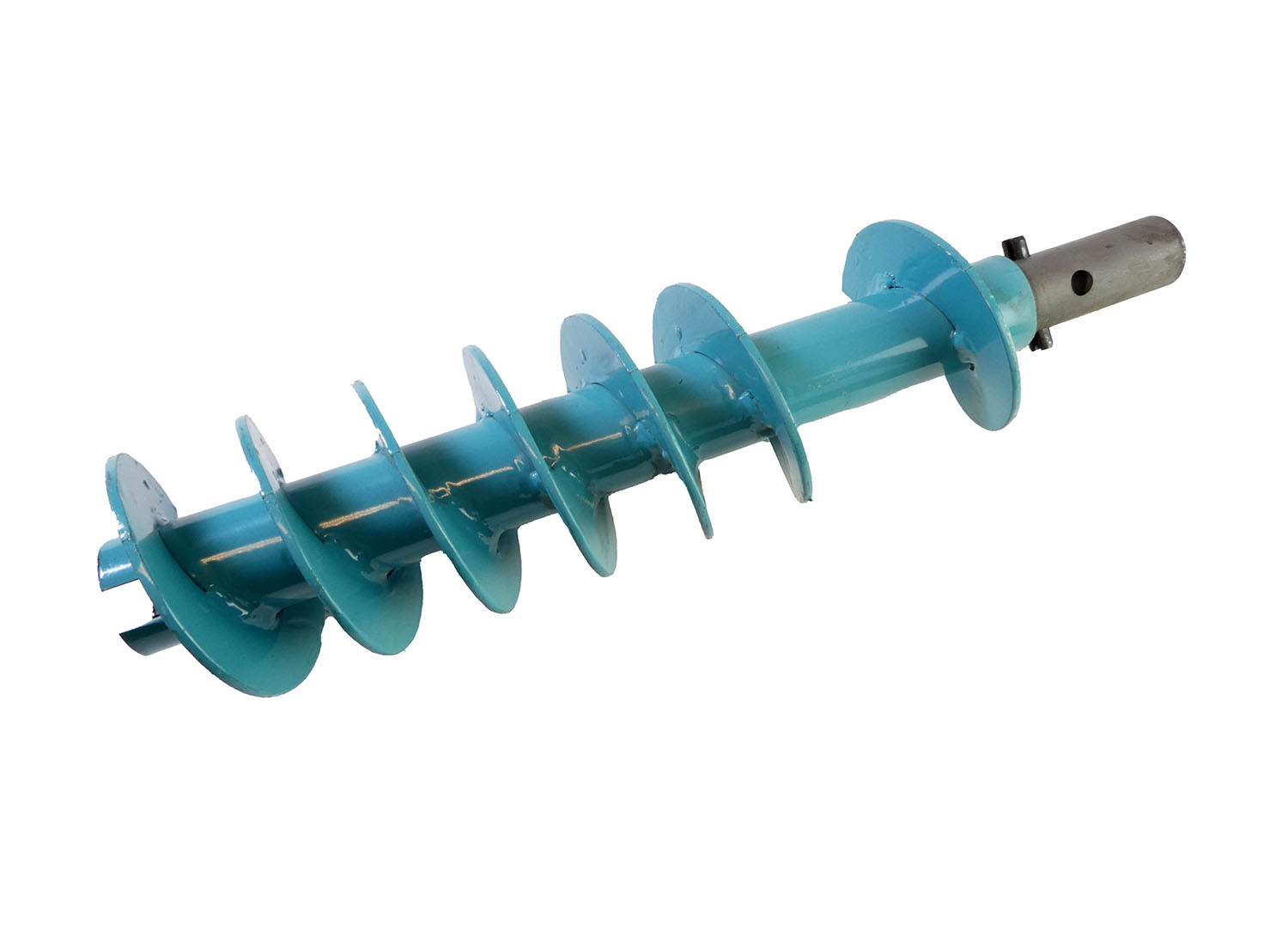 Die Dosierwelle für Teflonlager sorgt für das richtige Mischungsverhältnis von Wasser und trockenem Material. Die Fördermenge des Trockenmaterials von der Trockenzone in die Nasszone des Horizontalmischers hängt von der Steigung (ca. 35 mm) des Wendels ab. Bei dieser Dosierwelle ergibt sich eine fertig gemischte Menge von 20-25 l/min. Die Dosierwelle verbindet die Transportschnecke und die Mischwelle miteinander.