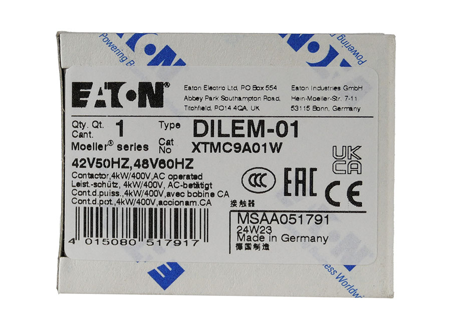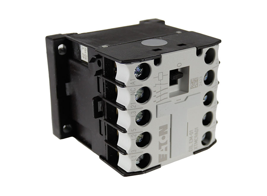 EATON Leistungsschütz DILEM-01 XTMC9A01W (42V 50Hz, 48V 60 Hz) 3-polig mit Schraubklemmen ist ein Kleinschütz mit Hilfsschalter für Motoren (auch für Motoren der Effizienzklasse IE3) und ohmsche Lasten.