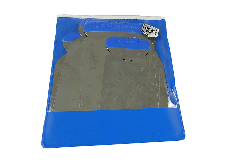 Japanspachtel-Satz (4 Spachtel) ERGO rostfrei, flexible 0,31 mm Blattstärke mit Härte II und ergonomisch geformten Kunststoffrücken. Der Japanspachtel ermöglicht präzises Arbeiten und eignet sich besonders gut für das Auftragen von Spachtelmasse, das Füllen von Rissen oder Löchern sowie das Glätten von Oberflächen vor einem Neuanstrich oder Tapezieren.