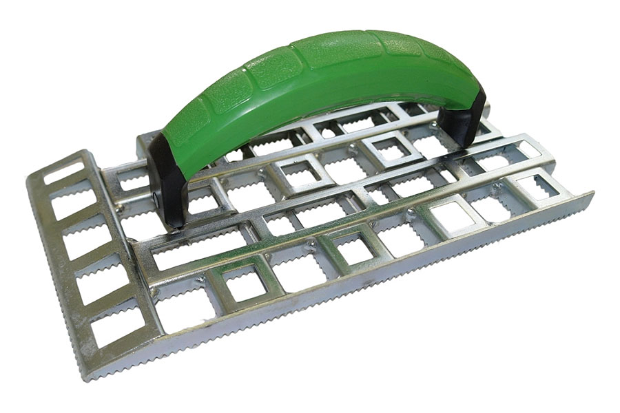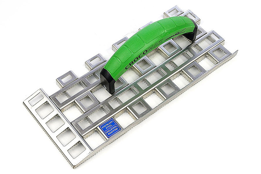 Der CrocoMax Profi-Schleifraspel gezahnt wird in der Regel zum Abschleifen von Zementfugenresten auf Roh-Mauerwerk genutzt. Die Stirnseite hat eine schräge Kante, so dass auch schwer zugängliche Arbeitsflächen bearbeitet werden können und ein Zugang zu Fallrohren und Rohrleitungen kein Problem darstellen. Der Grundkörper ist aus hochwertigem, verschleißfestem V2A Stahl (Edelstahl rostfrei) mit hoher Zähigkeit und weist daher eine robuste und solide Konstruktion auf. Der Schleifraspel hat einen ergonomisch geformten und schlagfesten 2-Komponenten Griff (Softgriff) aus hochwertigem Kunststoff. Der CrocoMax wird häufig in Bereichen wie Kalk-Zement, WDVS, Weichfaserplatten, Holzfaserplatten, Styrodure, Lamelle, Sandstein und Porenbeton angewendet und ist z.B. hervorragend für Stuckateure und Fliesenleger geeignet. Die Verzahnung entstand durch moderner Hochdruck-Wasserstrahl-Schneidetechnik. Dadurch sind die Zähne tiefer in die U-Profile eingeschnitten. Sie sind spitz und scharfkantig.