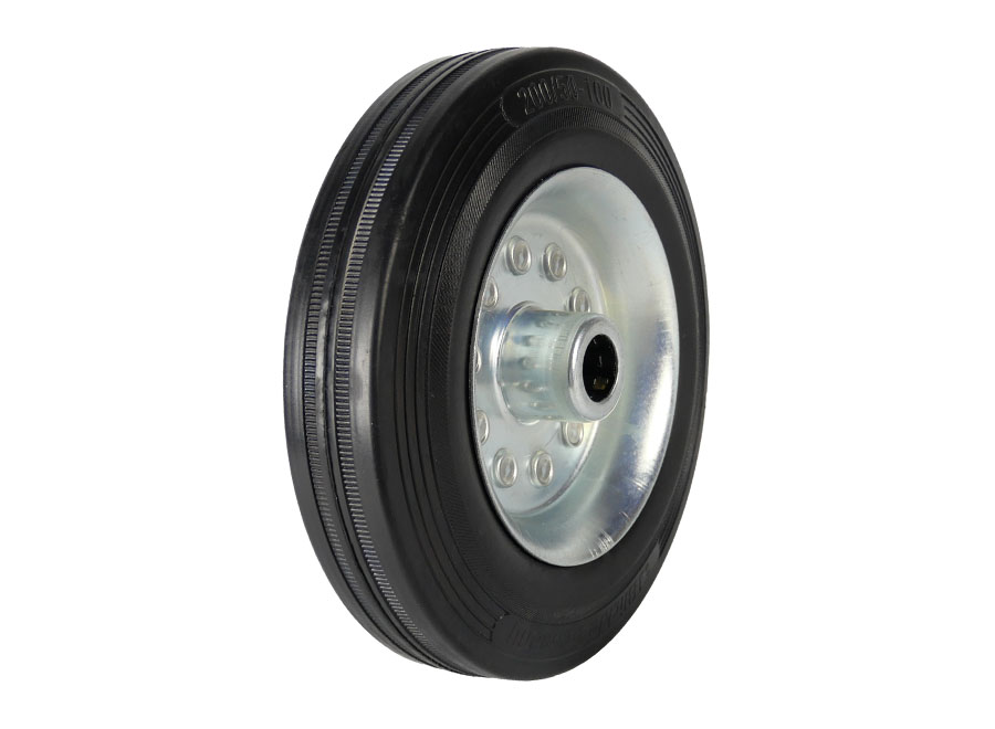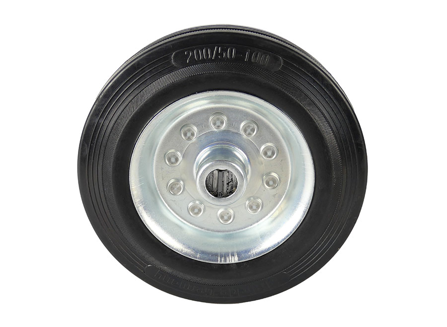 Rad mit Standard-Vollgummireifen (Härte 80 Shore A) und gepresster Stahlblechfelge, galvanisch verzinkt und blau passiviert (Cr6frei) 200/20KU für die DTS. Dieses Rad bietet einen sehr hohen Fahrkomfort, ist sehr bodenschonend und hat einen geräuscharmen Lauf. Das Rad ist chemisch beständig gegen viele aggressive Medien, jedoch nicht gegen Öle. Es hat eine Temperaturbeständigkeit von -25°C bis + 80°C und eine verringerte Tragfähigkeit bei über +60°C.