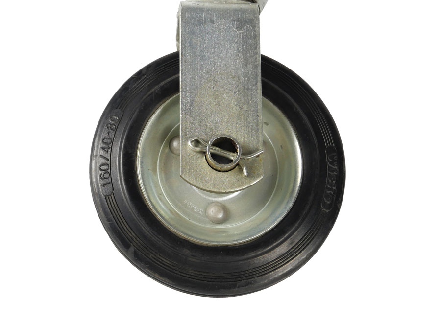 Standard-Vollgummi mit Blechfelge verzinkt für MBS 750. Das Rad hat eine Härte von ca. 82 Shore A und ein Rollenlager.