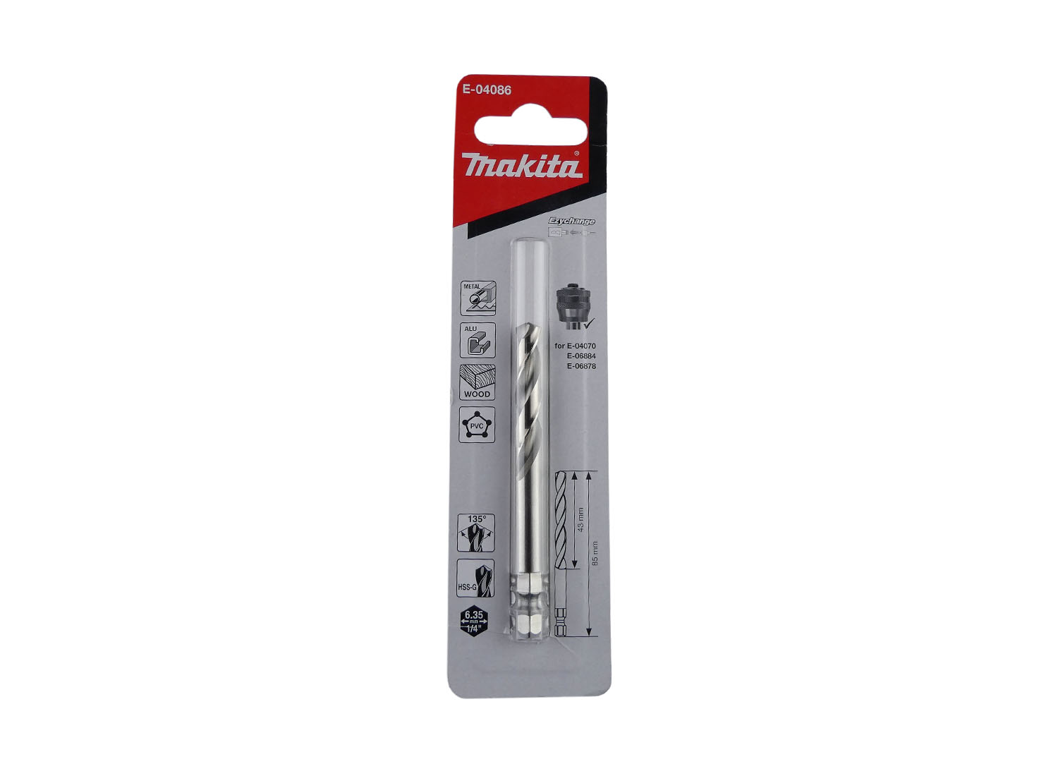 MaAKITA Ezychange Lochsägen HSS-G Zentrierboher, E-04086. Dieser präzisionsgeschliffene HSS-G Zentrierbohrer ⌀ 6,35 mm mit einer Gesamtlänge von 85 mm für Ezychange Lochsägen bis 44 mm Schnittiefe ist geeignet für Aluminium, Holz, Kunststoffe und Stahl. Durch das EZYCHANGE-Schnellwechselsystem ist ein werkzeugloser schneller Wechsel der Lochsäge möglich.