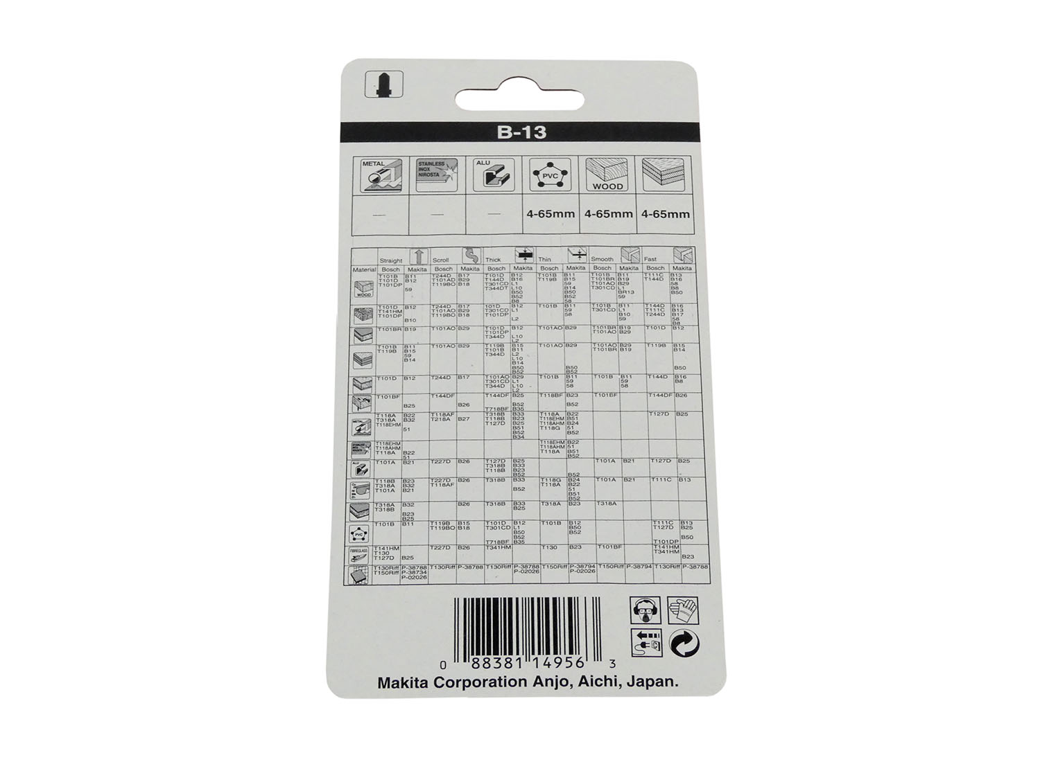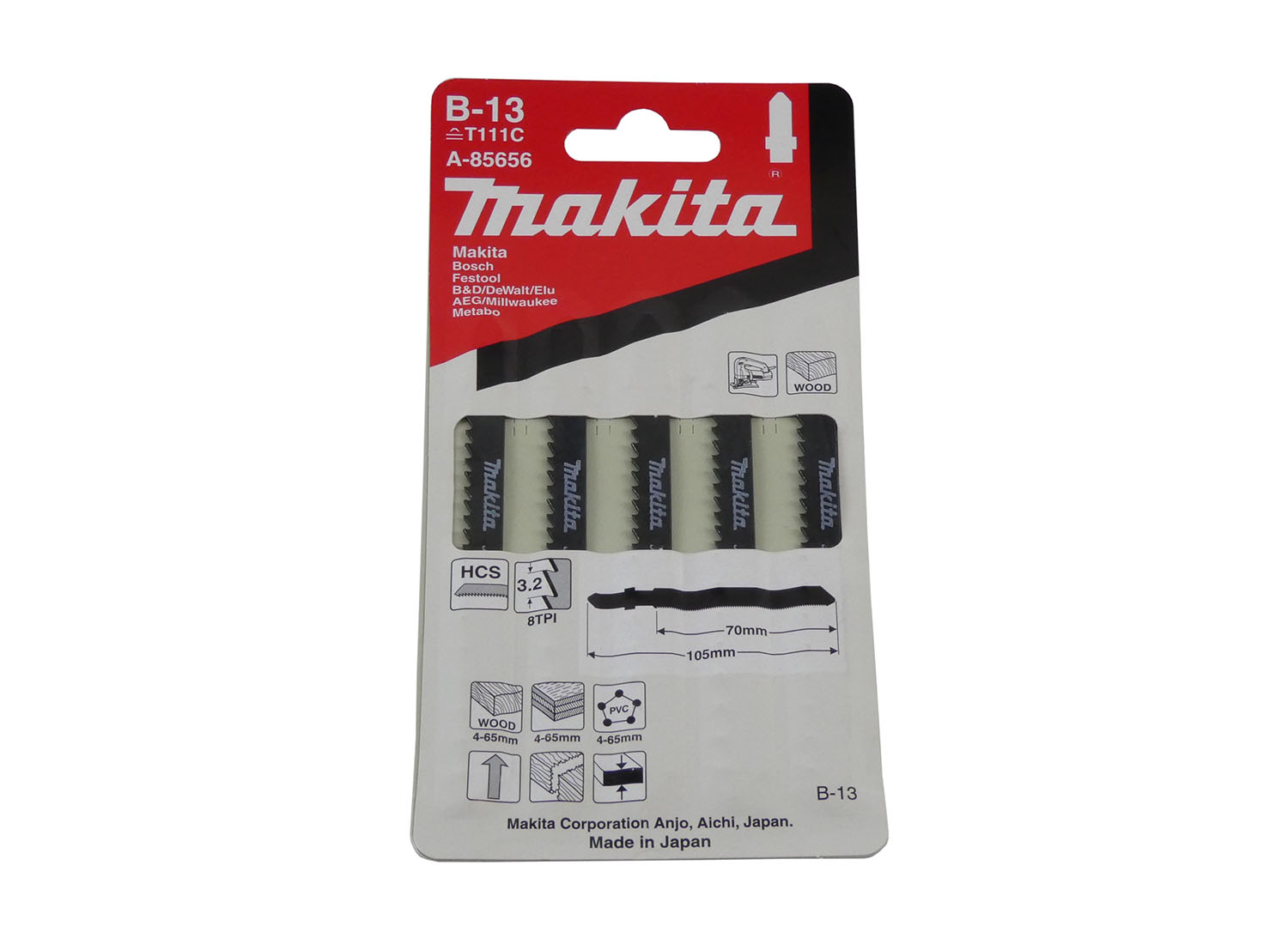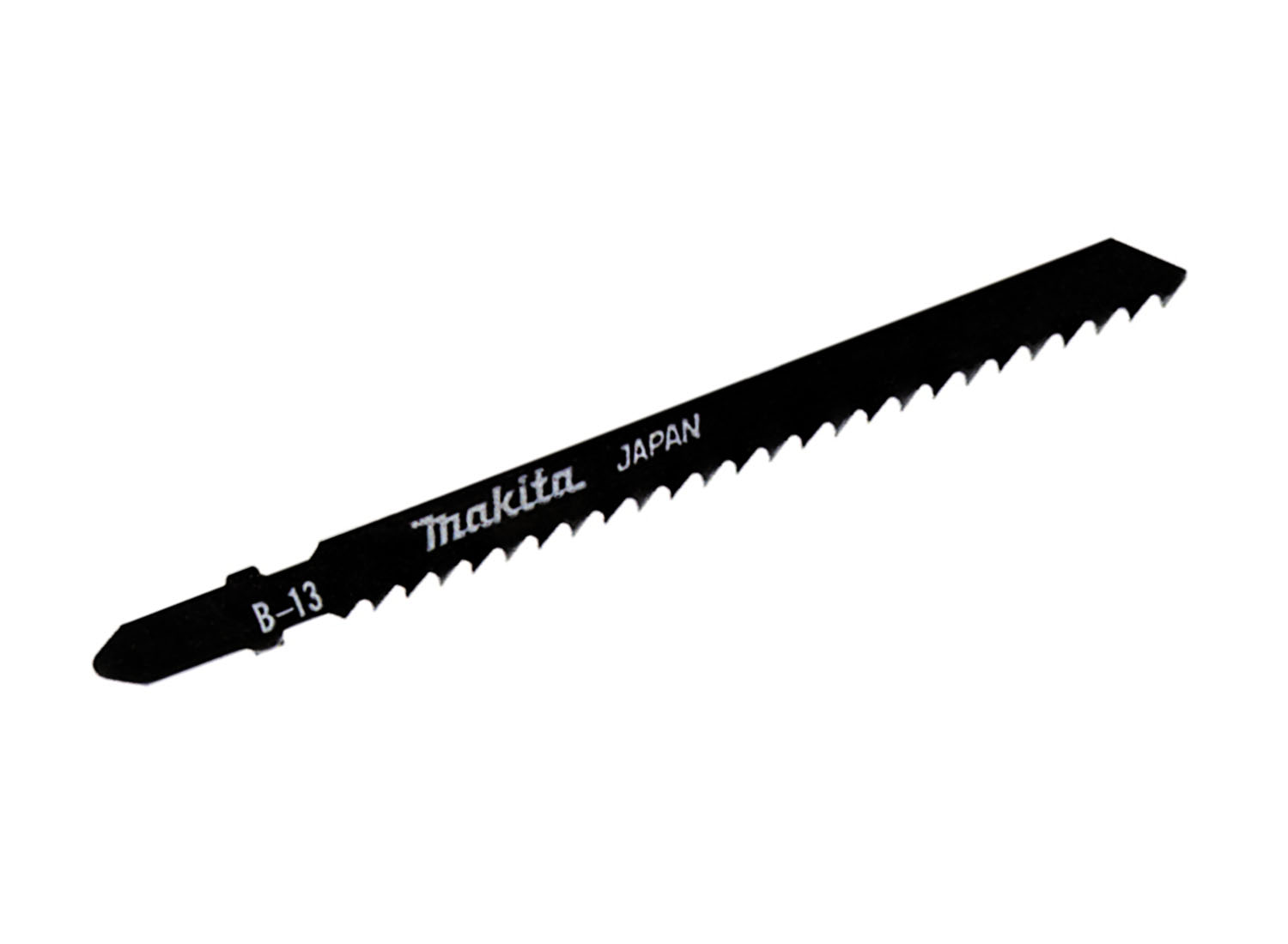 MAKITA Stichsägeblatt B-13, A-85656 mit einer sehr scharfen kreuzgeschliffenen und geschränkten Verzahnung mit 3,2 mm Zahnteilung. Für schnelle Schnitte in Weichholz und Kunststoffen von 4 bis 65 mm Materialstärke.