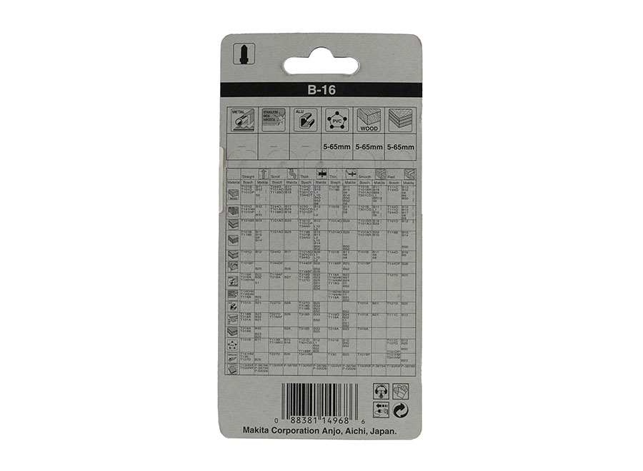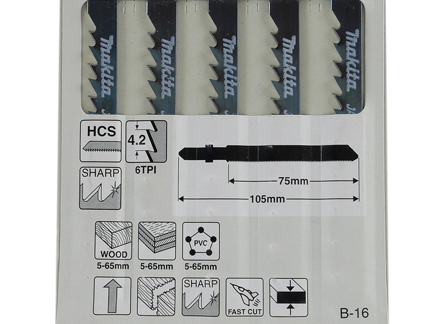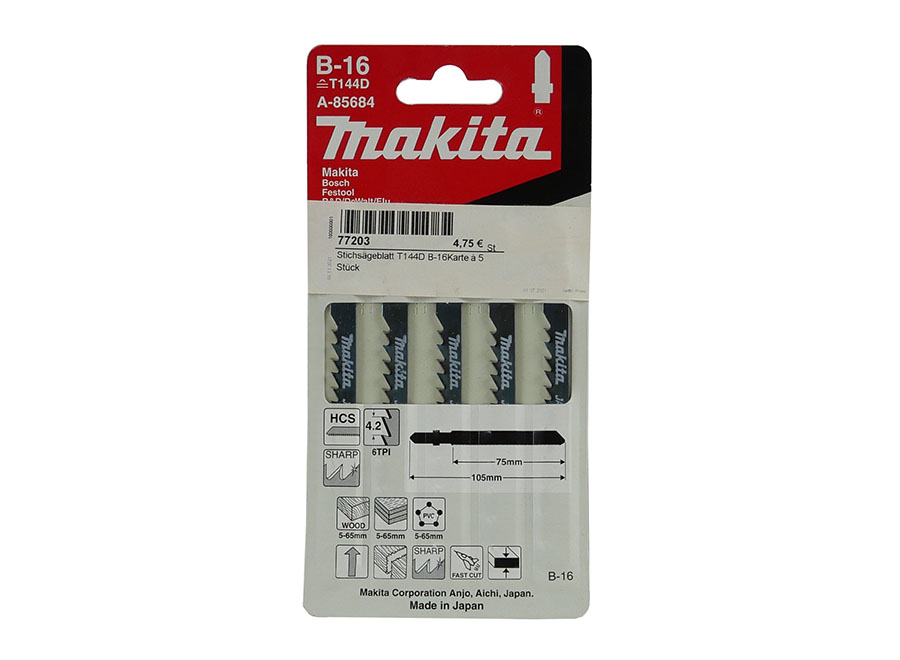 Das MAKITA Stichsägeblatt B-16 T144D A-85684 mit einer sehr scharfen kreuzgeschliffenen und geschränkten Verzahnung mit 4,2 mm Zahnteilung. Das Sägeblatt ist ideal für sehr schnelle, agressive Schnitte in allen Hölzern und Kunststoff von 5 bis 65 mm Materialstärke. Passend für alle Stichsägen mit T-Schaft-Aufnahme.