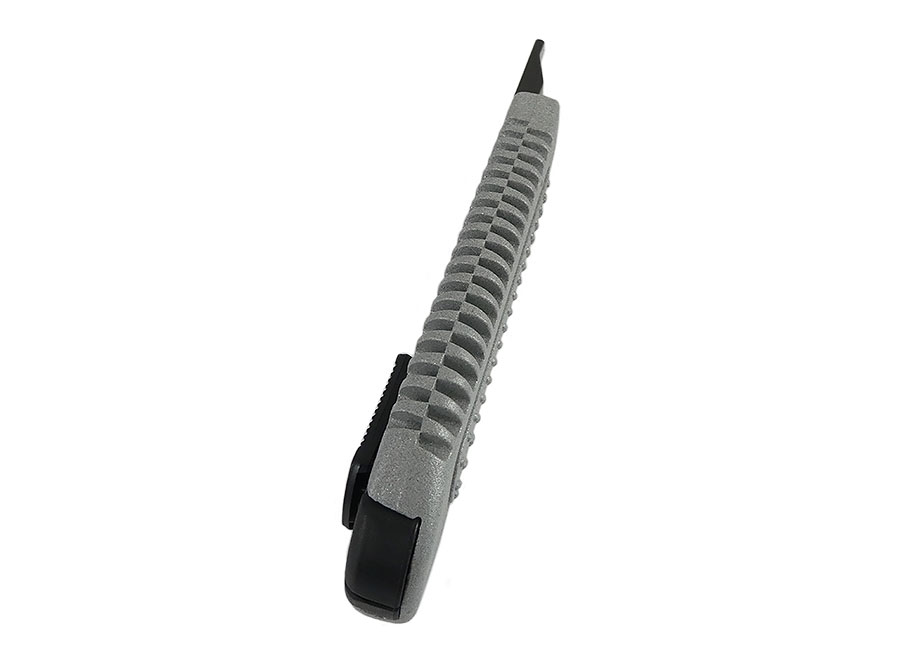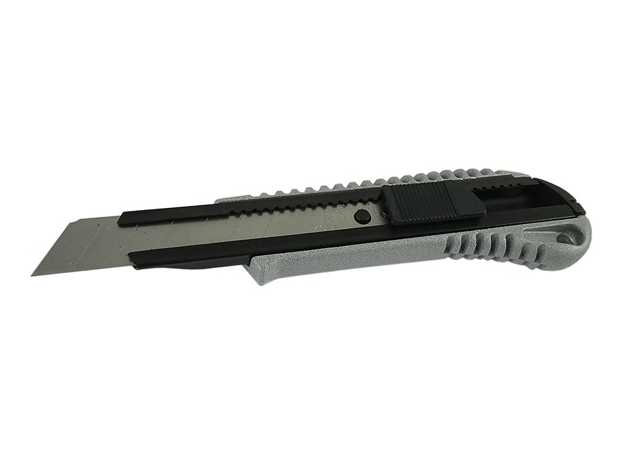 Dieses FRIESS Cuttermessser grau 18 mm mit Abbrechklinge und mit Metallgehäuse. Der verstellbare Klingenhalter lässt die Klinge, durch einfaches vor- und zurückschieben, bewegen. Der Regulierungsschalter kann eingerastet werden, sodass die Klinge festsitzt und beim Schneiden nicht verrutschen kann. Das Gehäuse weist eine angenehme Form auf, um das Schneiden wohltuender für das Handgelenk zu gestalten. Die Abbrechklinge gilt als praktische Ersatzklinge eines Cutter- oder Teppichmessers. Der stumpf gewordene Schneidebereich der Klinge lässt sich einfach entlang einer vorgefertigten Bruchstelle entfernen.