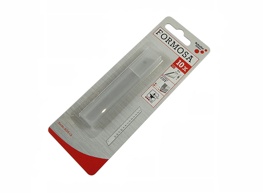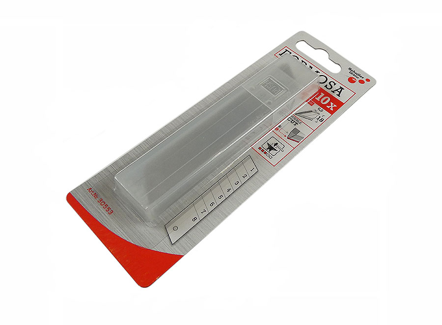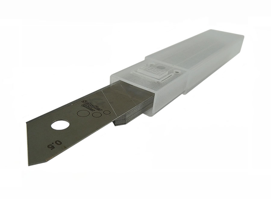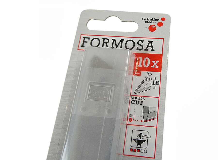 Die SCHULLER Ersatzklinge / Abbrechklinge FORMOSA RAN gilt als praktische Cutterklinge eines Cutter- oder Teppichmessers. Der stumpfgewordene Schneidebereich der Abbrechklinge / Ersatzklinge lässt sich einfach entlang einer vorgefertigten Bruchstelle entfernen. Die Abbrechklingen sind 9 bzw. 18 mm breit und 0,4 bzw. 0,5 mm dick.