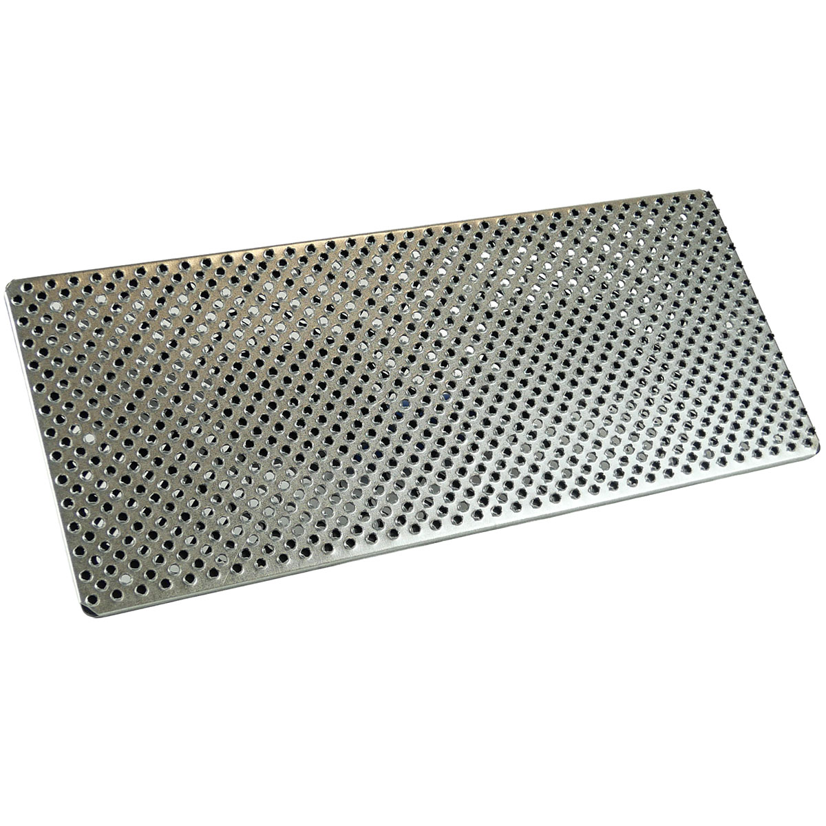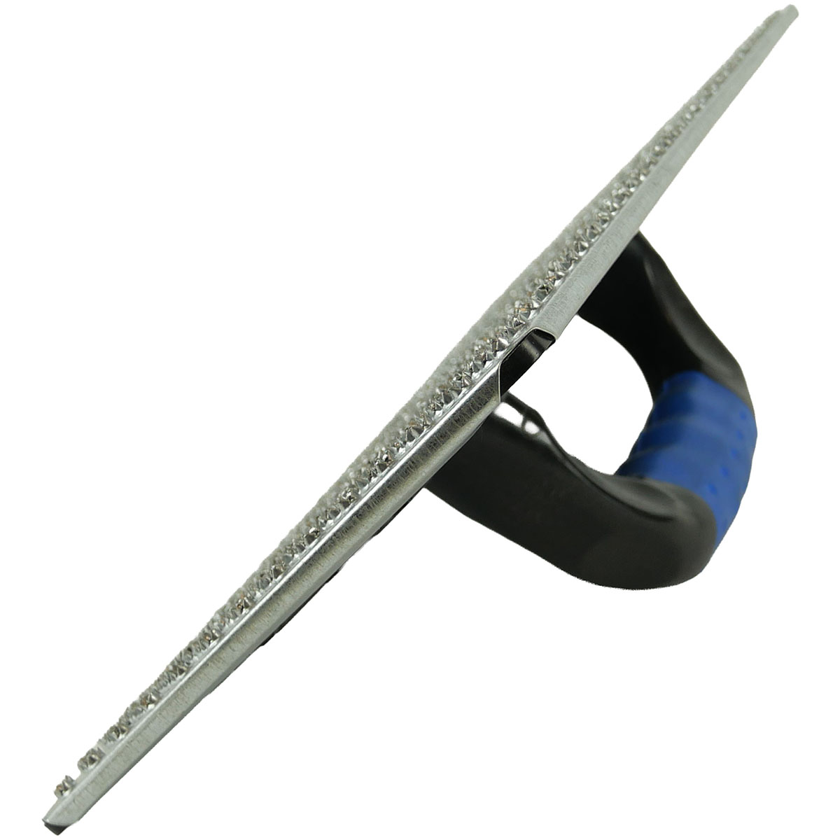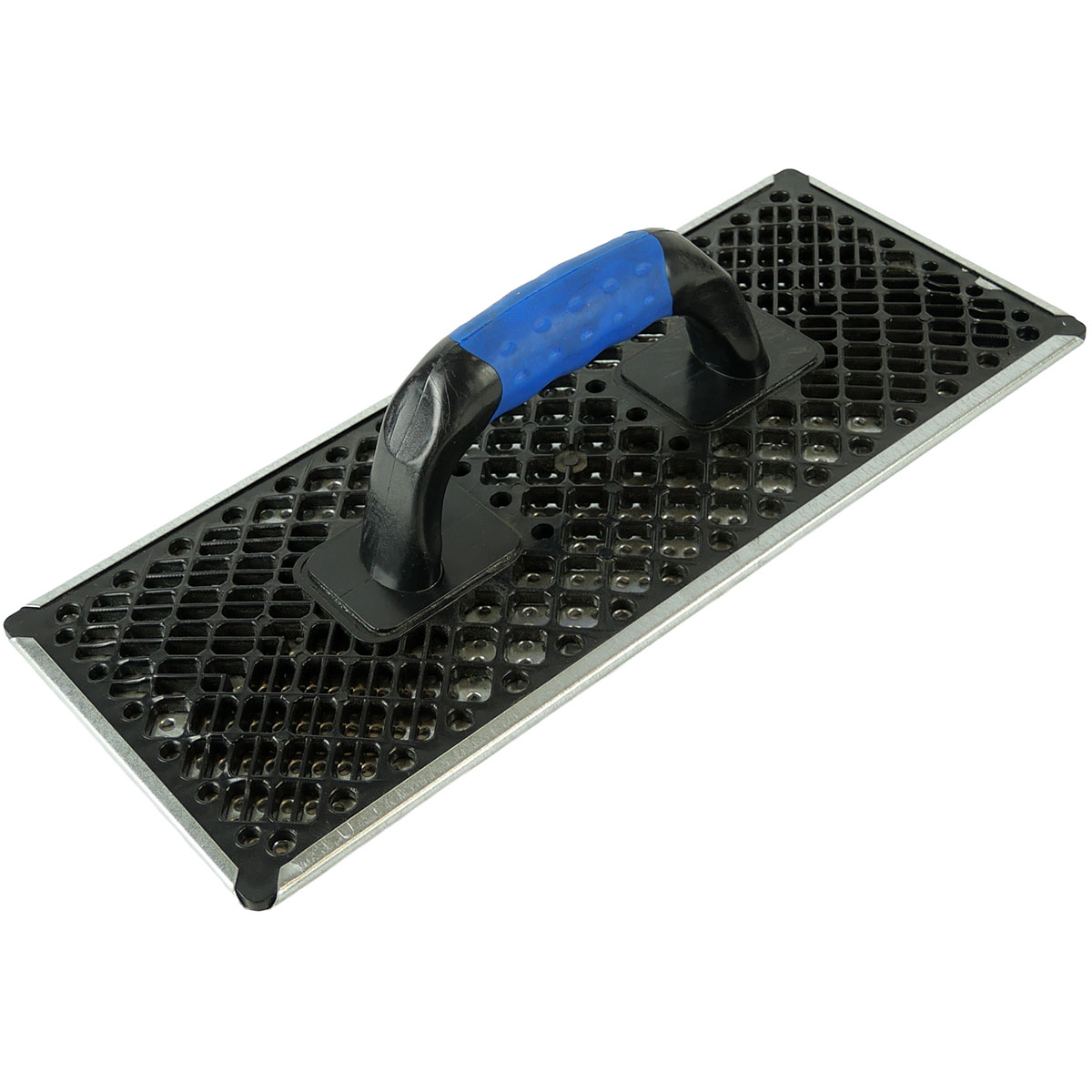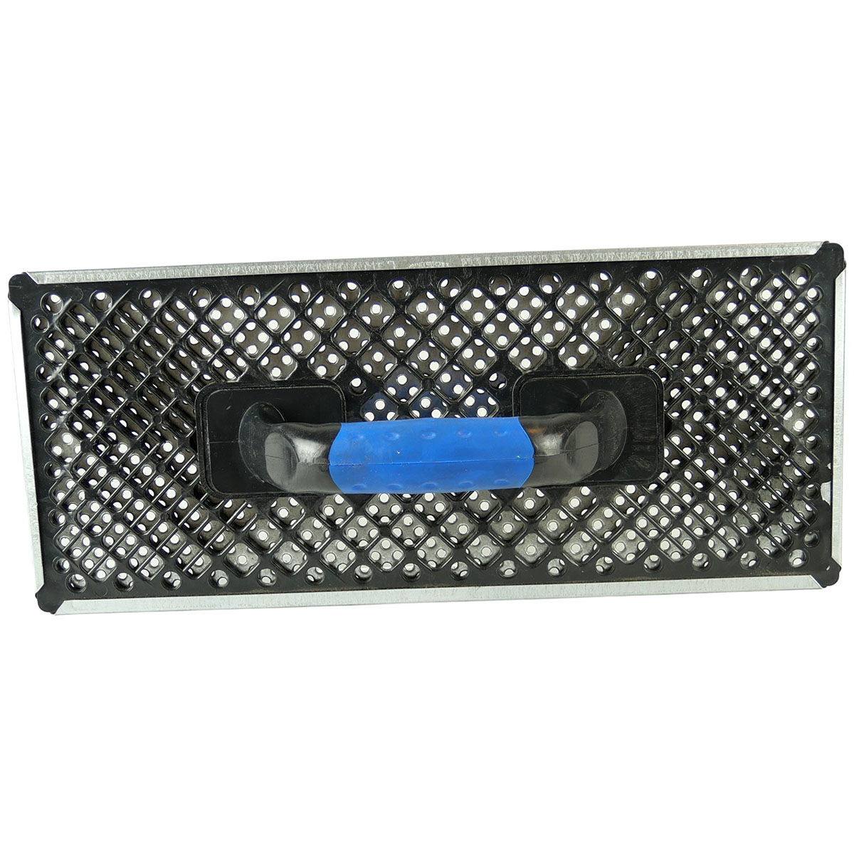 Das Schleifbrett / Egalisierungsbrett / Kratzbrett mit robustem Stahlblech-Raspelbelag, der eine effiziente und präzise Bearbeitung von Styropor-Oberflächen ermöglicht. Die Kunststoffoberseite ist gegittert, um Gewicht zu sparen und einen Durchlass für die abgeschleiften Teilchen zu haben. Der ergonomische, geschlossene 2K-Kunstsoffgriff liegt gut und griffig in der Hand. Das Schleifbrett ist ein zuverlässiges Werkzeug für den Maurer und Verputzer.
