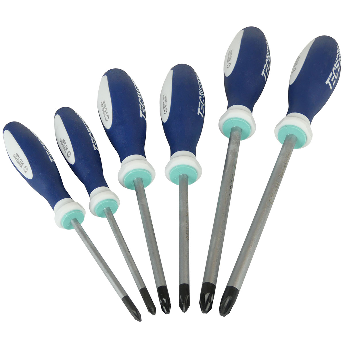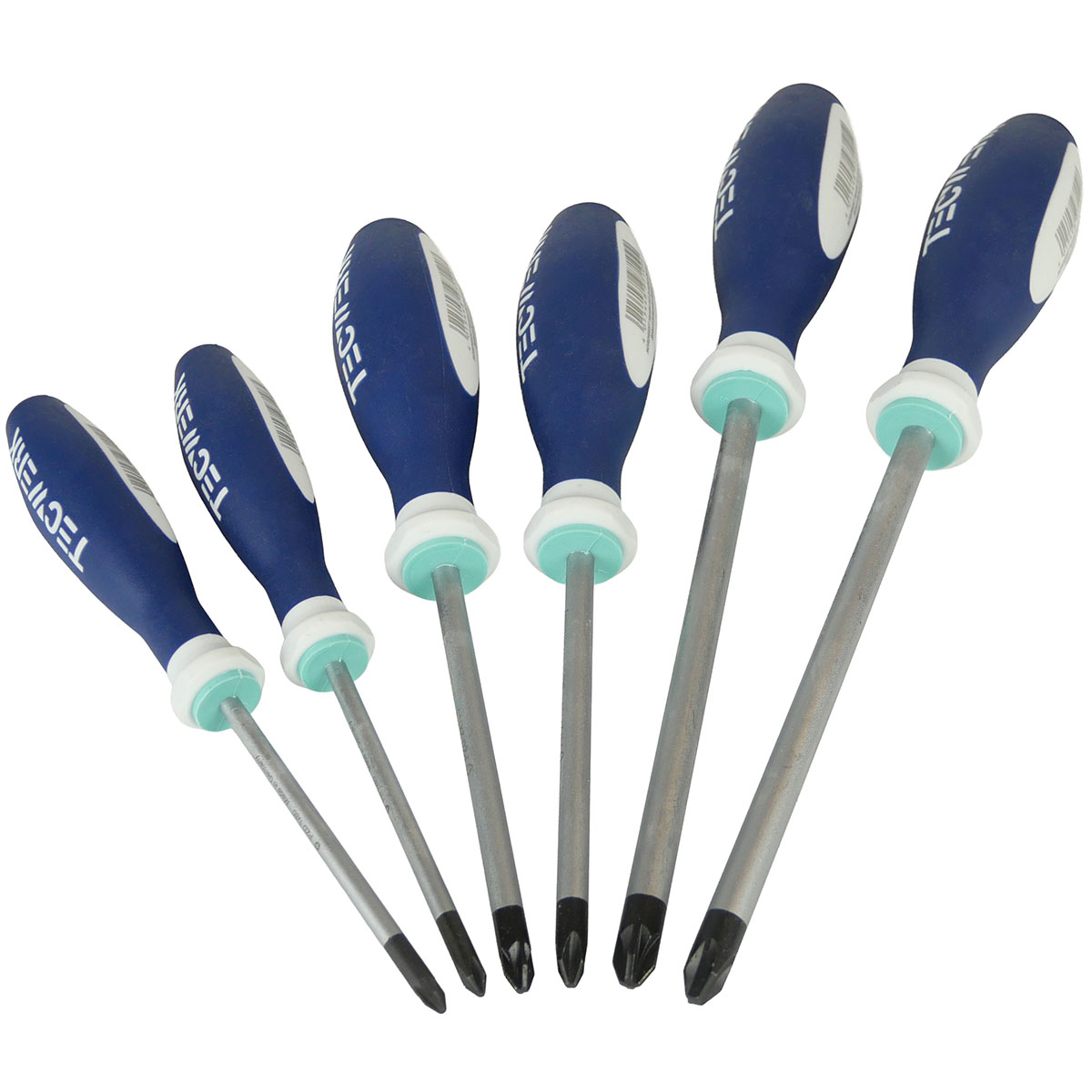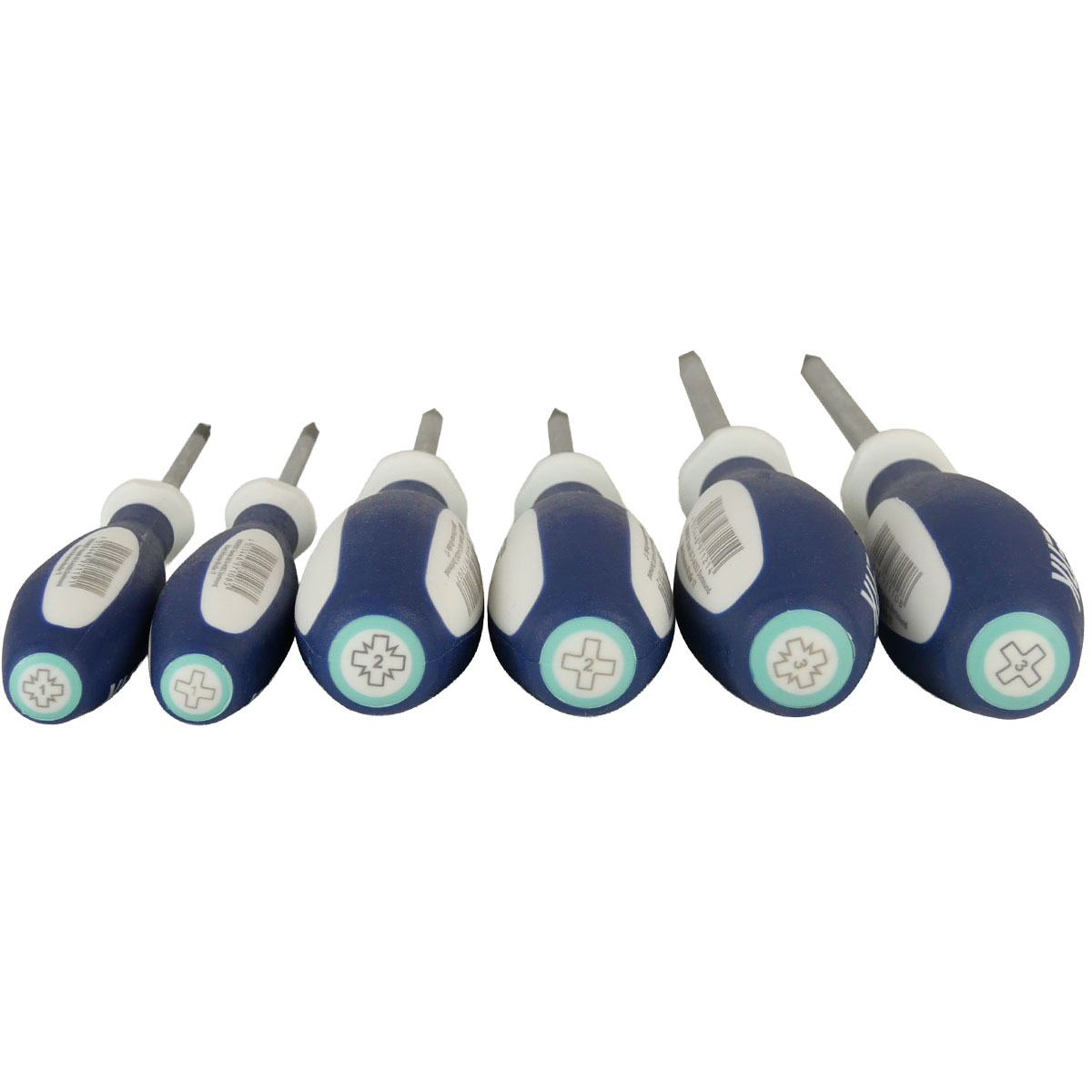 Schraubendrehersatz mit Mehrkomponentengriff mit Abrollschutz, Klingen aus vergütetem Stahl (matt verchromt), Größenleitsystem und Rundklinge.