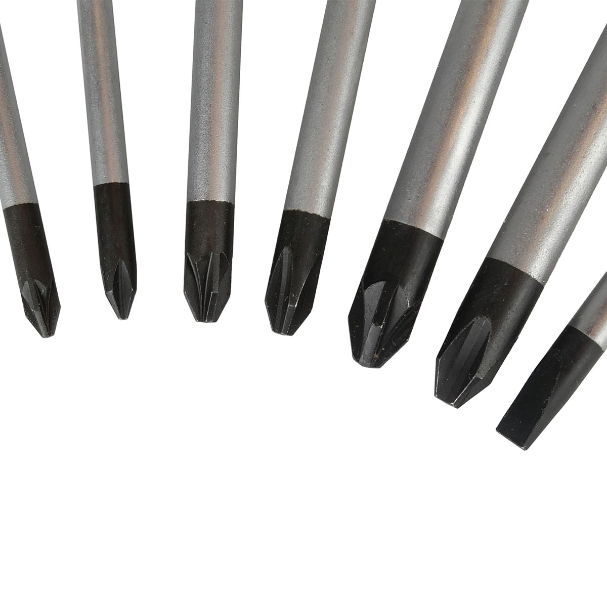 Schraubendrehersatz Mix mit Mehrkomponentengriff mit Abrollschutz, Klingen aus vergütetem Stahl (matt verchromt), Größenleitsystem und Rundklinge.