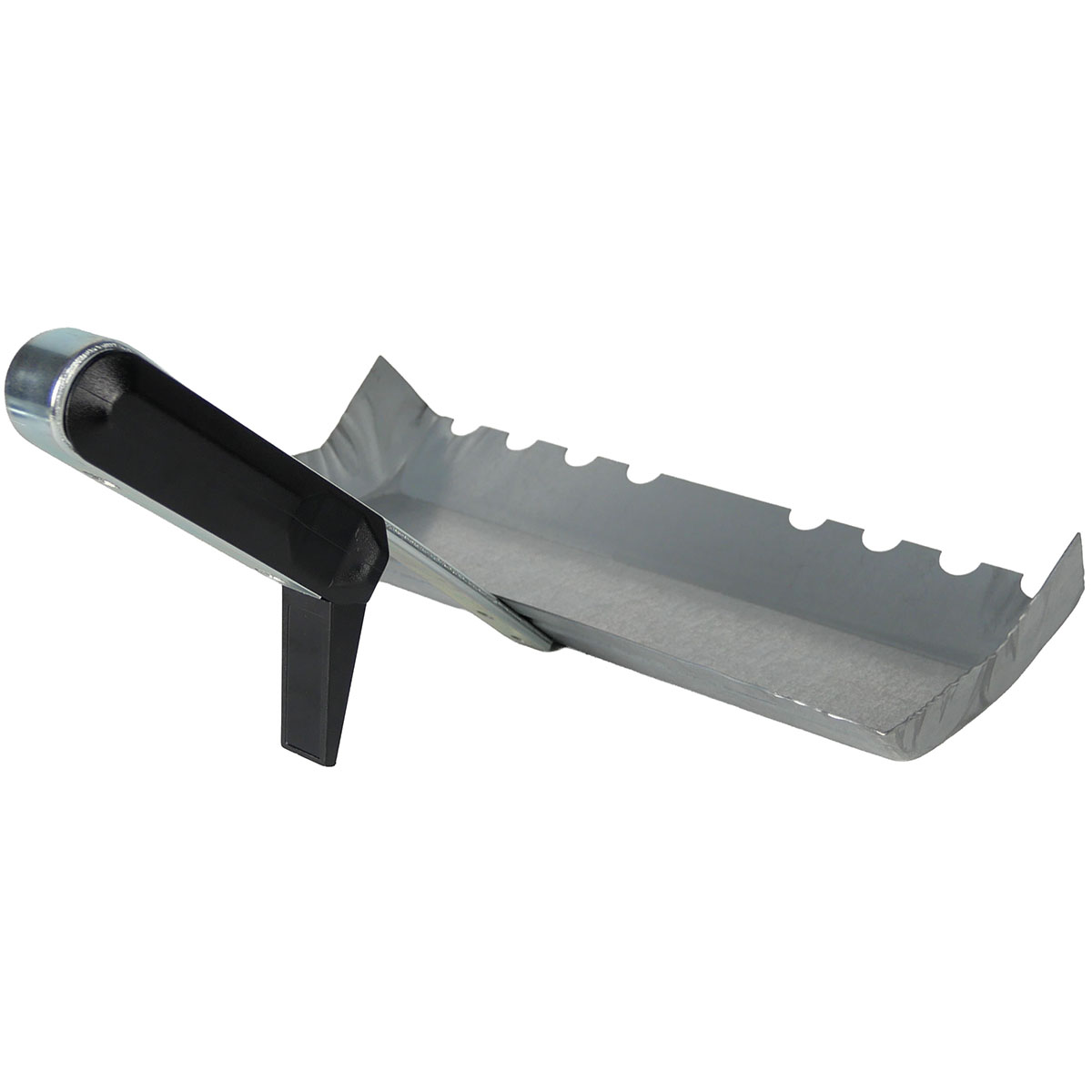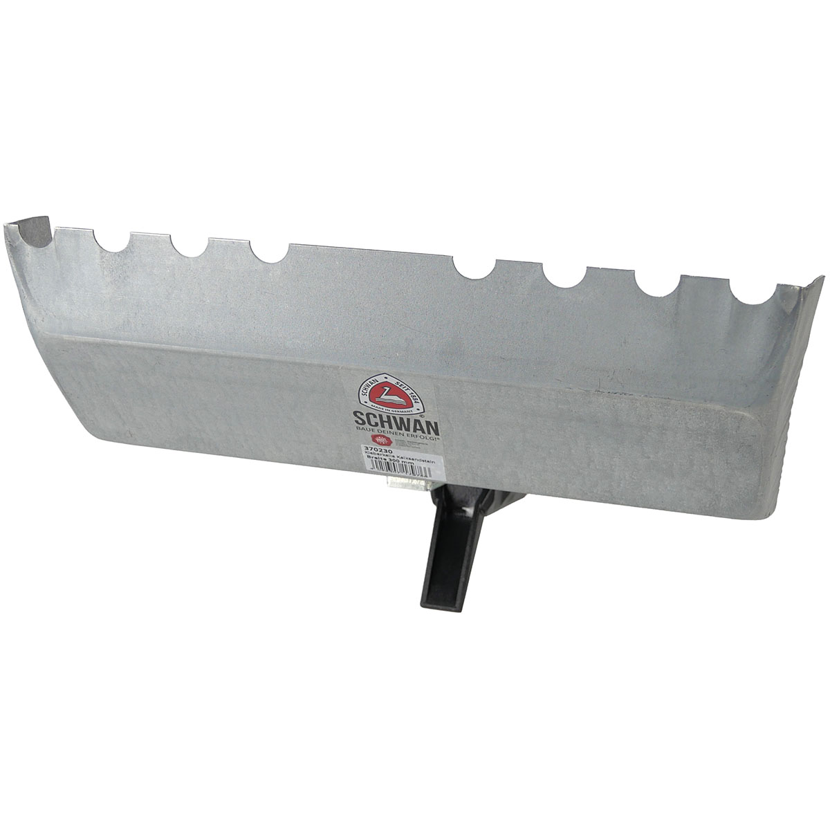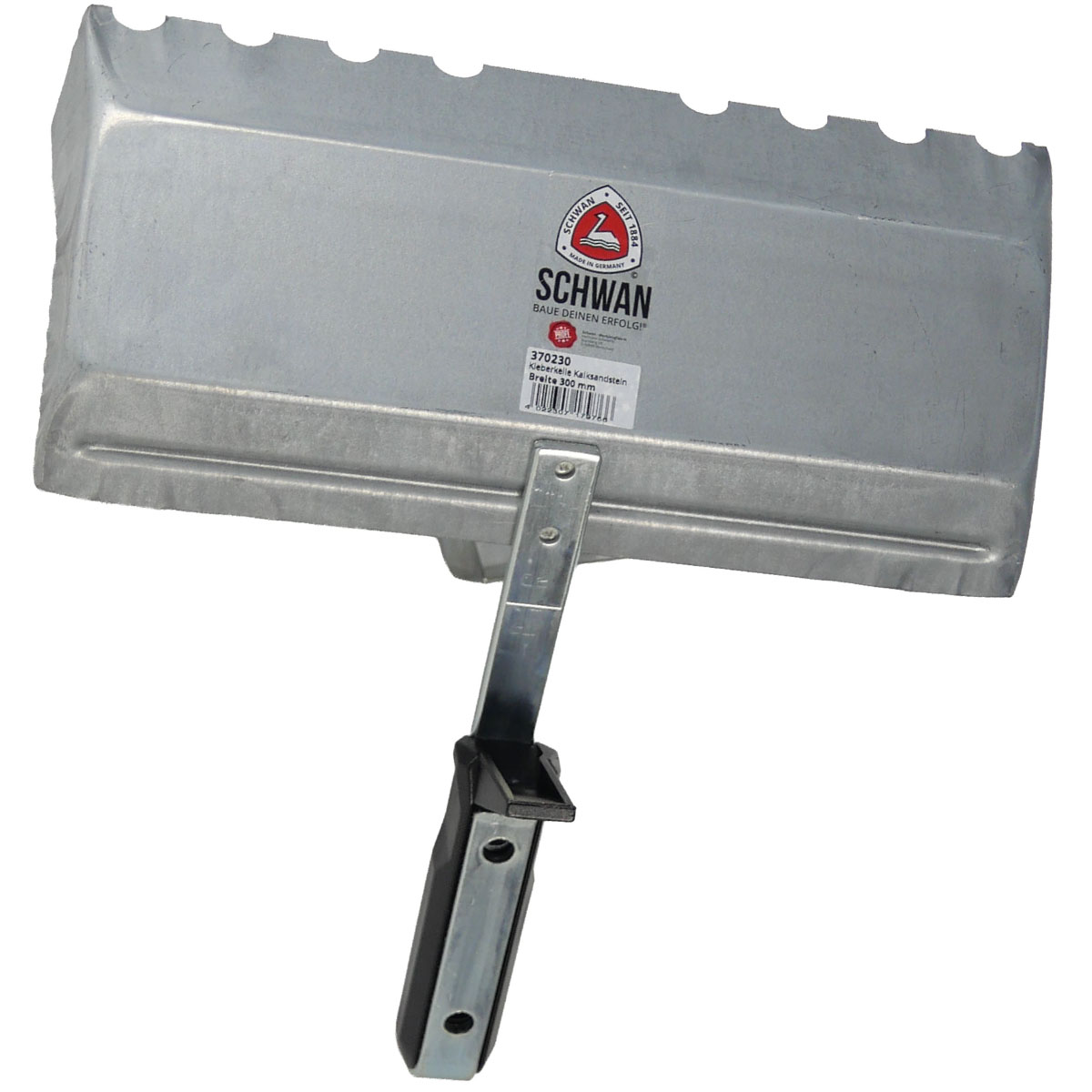Die gezahnte Klebekelle für Kalksandstein ist aus verzinktem Stahl mit Kunststoffgriff. Durch die Schaufelform wird der Kleber aufgenommen. Die Klebekelle hilft beim gleichmäßigen Verstreichen des Klebematerials auf den Stein. Es empfiehlt sich eine schmalere Kelle zum Bestreichen zu verwenden als der Stein breit ist, da sonst der Kleber zwischen den Steinen herrausquillt und runterläuft. Die Kelle hat einen Haken zum Einhängen in den Eimerrand.