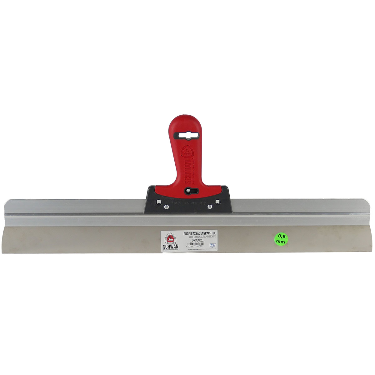 Flächenspachtel sind für großflächige Spachtelarbeiten ideal. Hierbei kommt es neben der nötigen Übung auch auf den richtigen Schwung an, der Spachtel wird mit weiten Bewegungen über die Fläche gezogen und zieht sie so glatt. Für ein perfektes Ergebnis ist die Verwendung eines hochwertigen Werkzeugs von Bedeutung. Der Griff dieses Profi-Fassadenspachtels ist mit zwei Bohrungen versehen, an denen ein Gelenk befestigt werden kann. Auch das geringe Gewicht überzeugt in der Praxis.