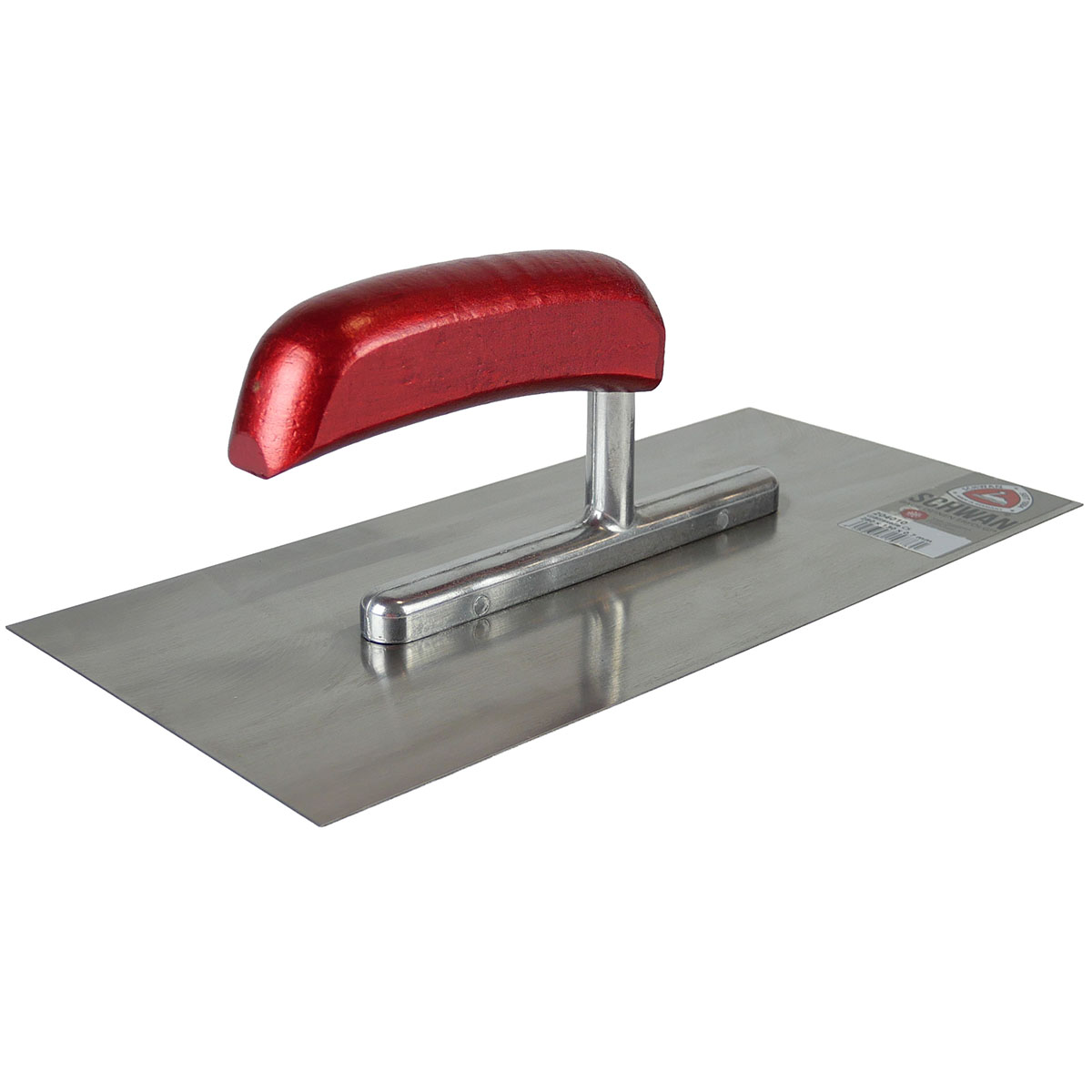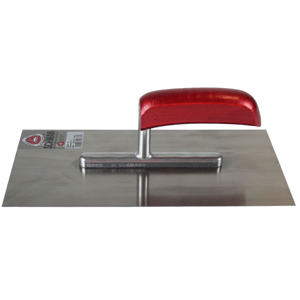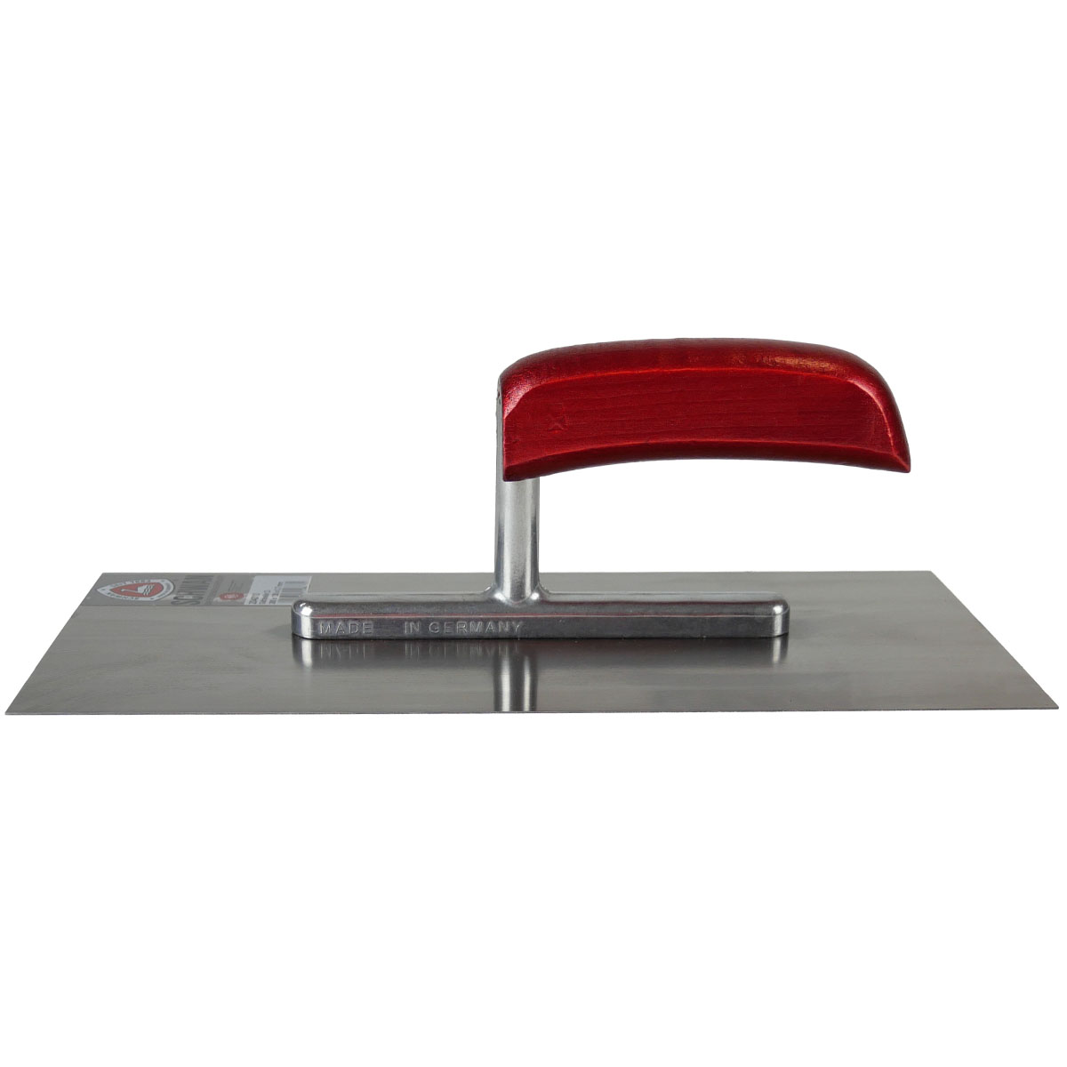 Glättekelle 280 x 130 mm mit gebogenem Holzheft, mit Zinkdruckgussstütze und einer Blattstärke von 0,7 mm. Made in Germany.