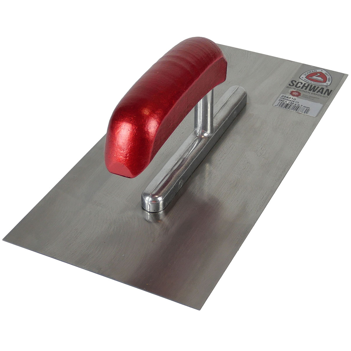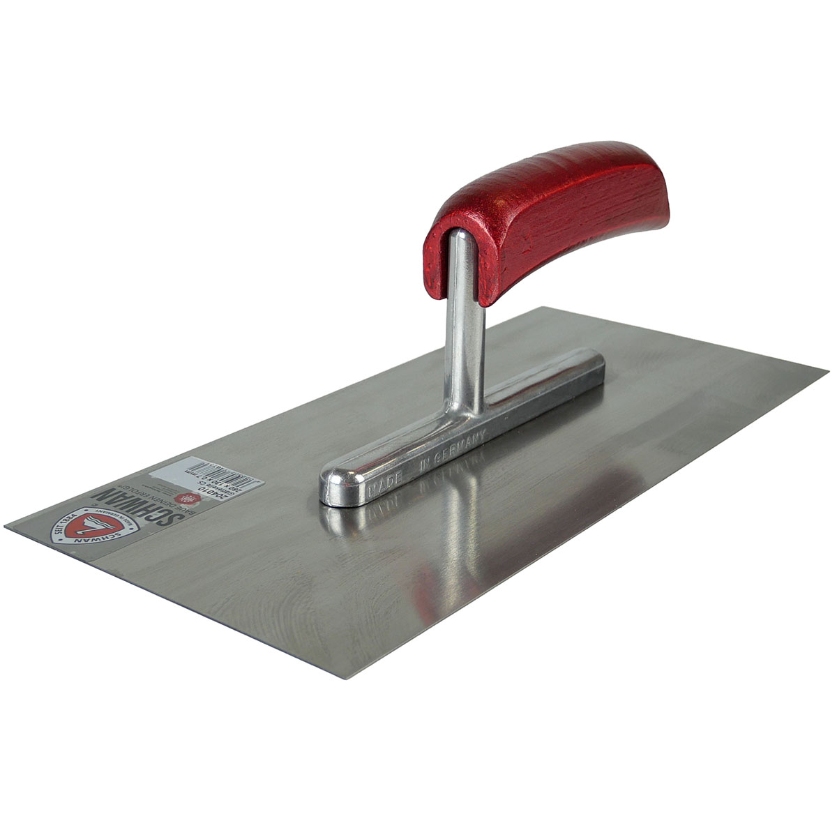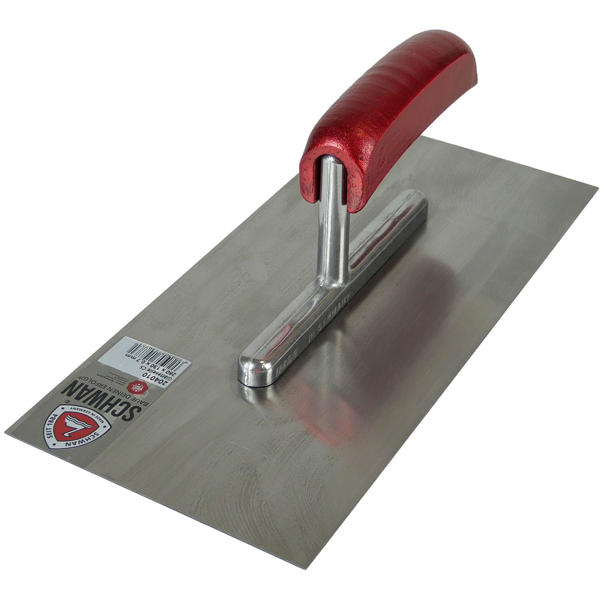Glättekelle 280 x 130 mm mit gebogenem Holzheft, mit Zinkdruckgussstütze und einer Blattstärke von 0,7 mm. Made in Germany.