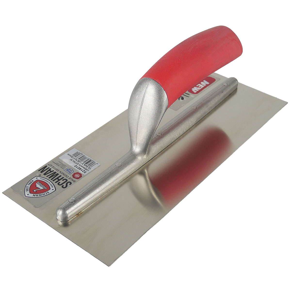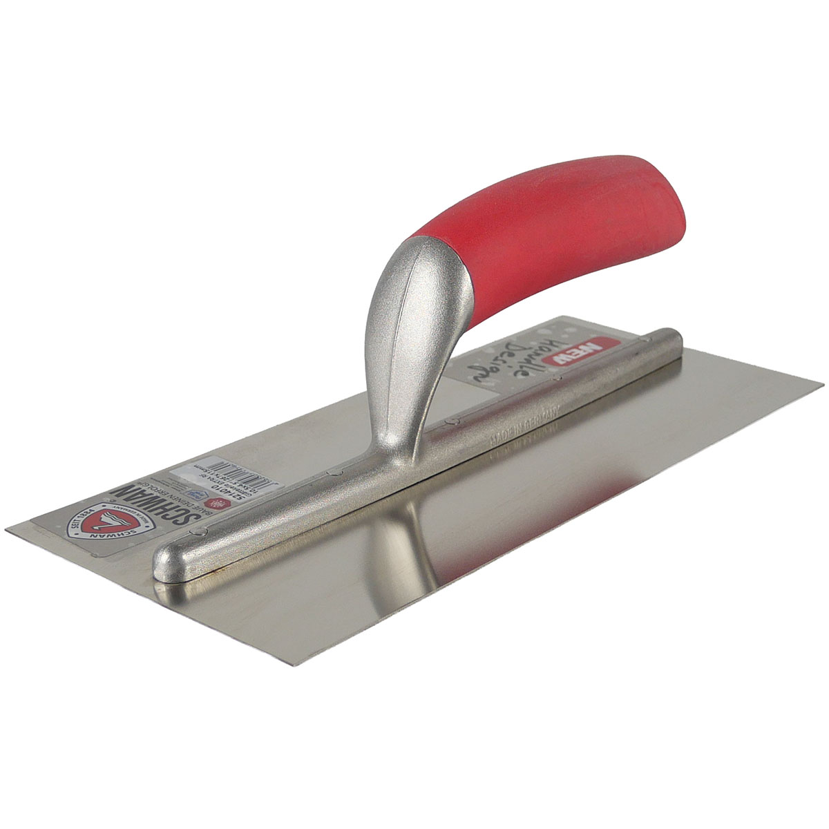 Die hochwertige Glättekelle STEADY 280 x 130 x 0,7 mm hat einen rutschfesten SOFT-FOAM Griff, eine extra lange und solide "Secure Connect"-Aluminiumstütze mit durchgehenden Bolzen für eine sichere Verbindung von Kellenblatt und Alustütze. Made in Germany im New Handle Design.