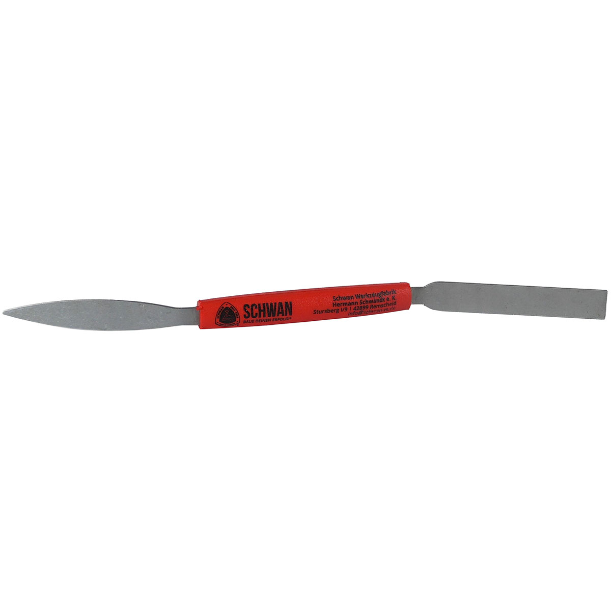 Das Gipseisen / Stukkateureisen mit federnden Blättern besitzt ein Kunststoff-Griffstück. Es hat abgekröpfte, federnde Blätter, eine Seite ist spitz, die andere gerade. Das Gipseisen ist für Renovier- und Restaurierarbeiten an kleinen, bzw. schwer zugänglichen Stellen geeignet. Es eignet sich hervorragend zum Ausbesseren kleiner Löcher und Risse.