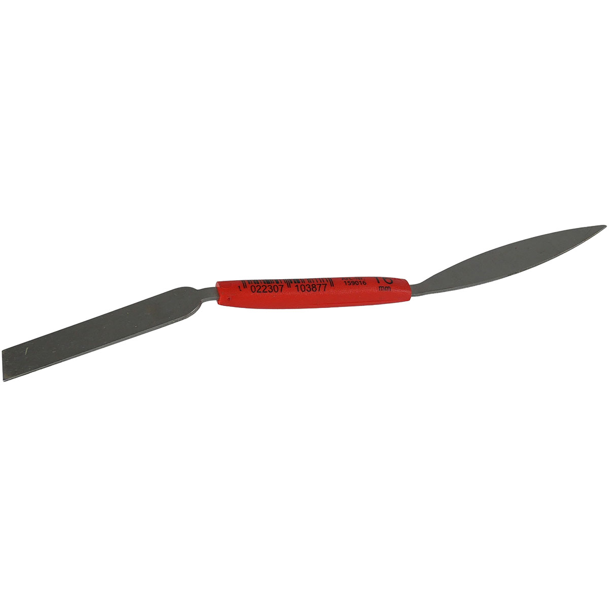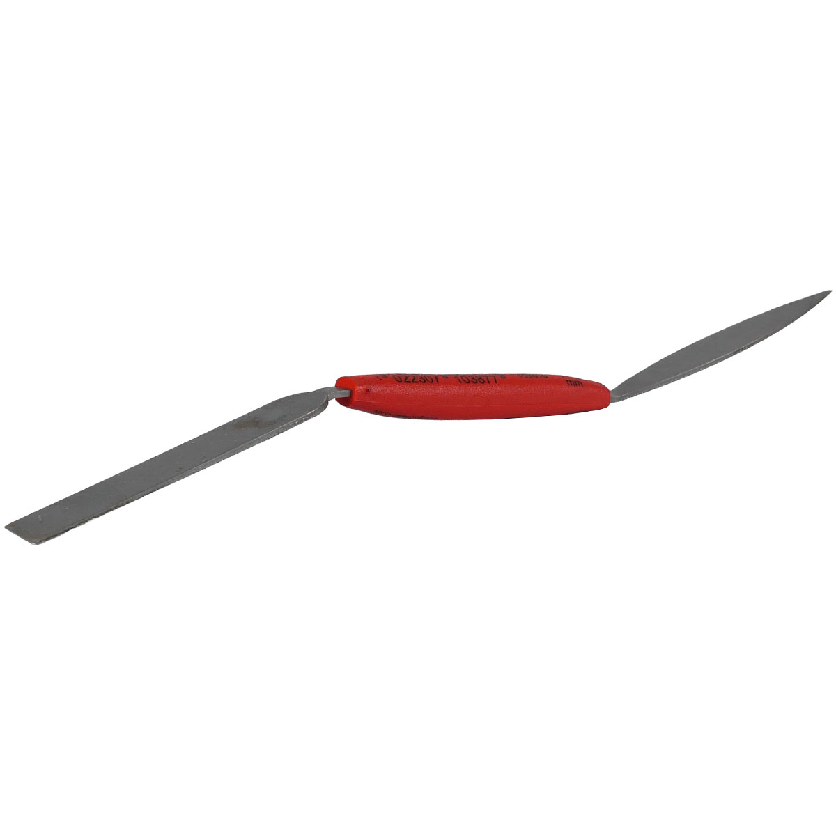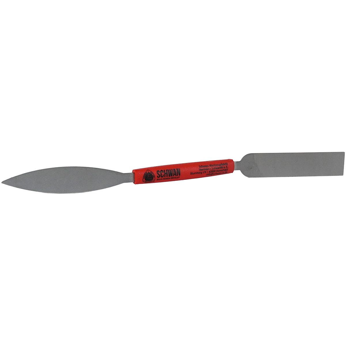 Das Gipseisen / Stukkateureisen mit federnden Blättern besitzt ein Kunststoff-Griffstück. Es hat abgekröpfte, federnde Blätter, eine Seite ist spitz, die andere gerade. Das Gipseisen ist für Renovier- und Restaurierarbeiten an kleinen, bzw. schwer zugänglichen Stellen geeignet. Es eignet sich hervorragend zum Ausbesseren kleiner Löcher und Risse.